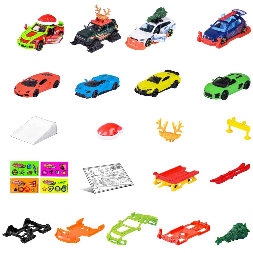 Som sædvanlig består kalenderen af 24 låger med 8 biler og 16 stykker tilbehør.