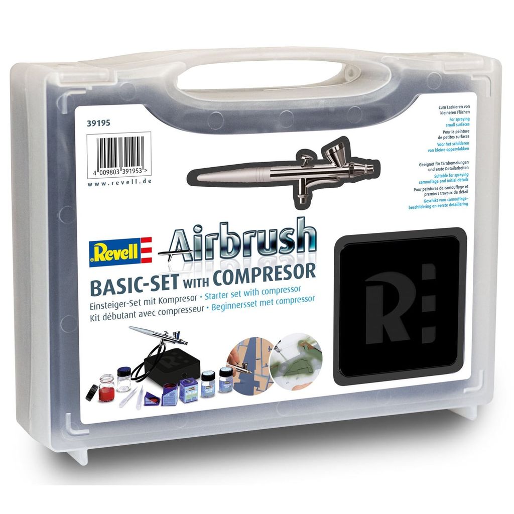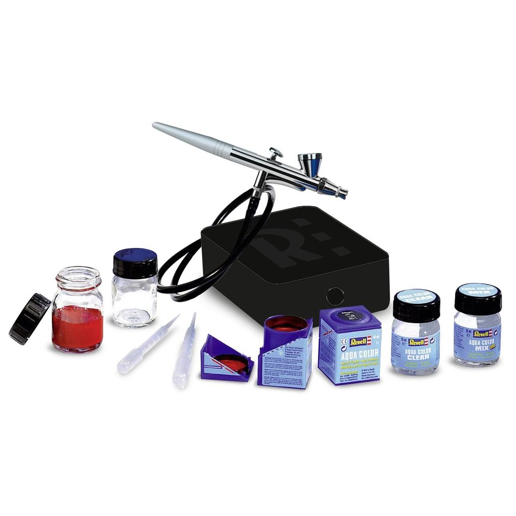 Airbrush Basic Set with Compressor Version 2023 fra Revell er et startsæt, der indeholder alt, hvad du skal bruge for at komme i gang med at sprøjtemale dine plastikbygningsmodeller med en malersprøjte.