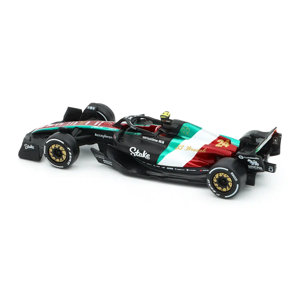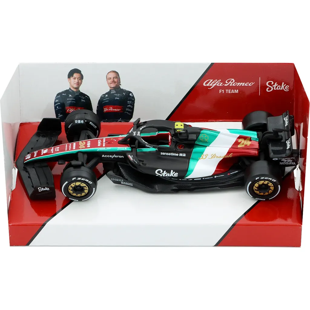 Model af C43 Formel 1-bilen fra Alfa Romeo. Denne bil, nummer 24, blev kørt under Italiens GP 2023 af Zhou Guanyu, som sluttede på en fjortendeplads under løbet, der blev vundet af Max Verstappen. Bilen er en del af Alfa Romeo F1 Team Stake-holdet fra Hinwil i Schweiz.