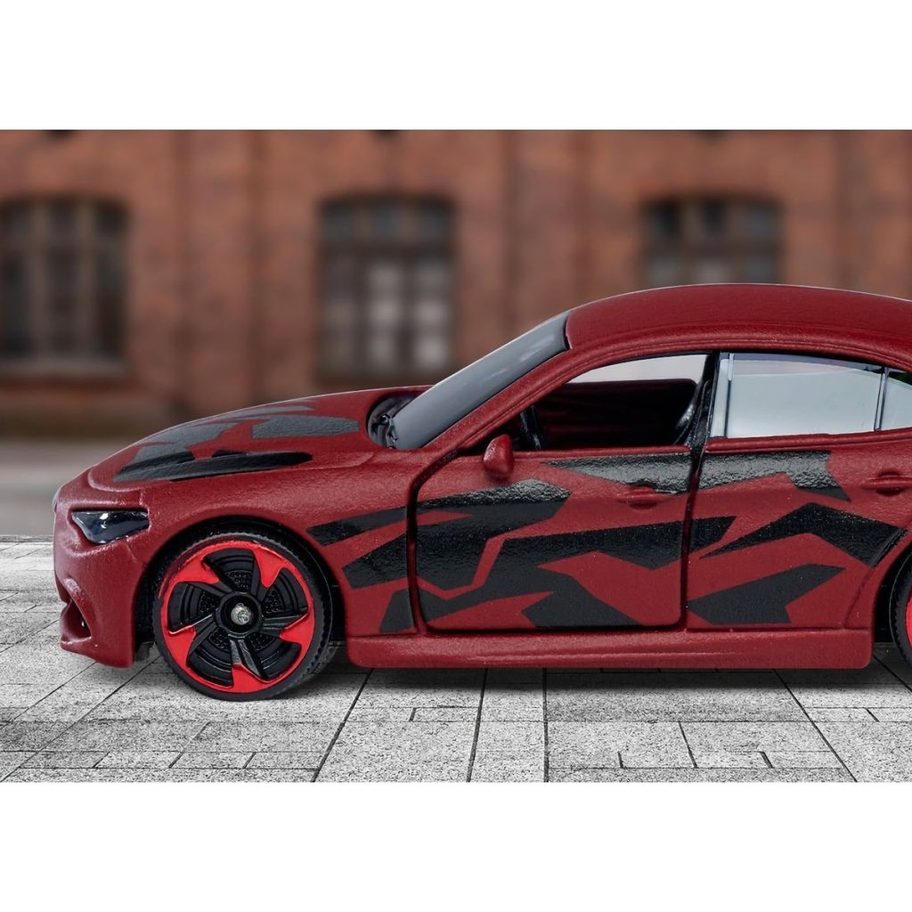 Alfa Romeo Giulia fra Majorette i deres serie Limited Edition - Series 8. Bilen er indfarvet i et bordeauxrødt og sort camouflagemønster.