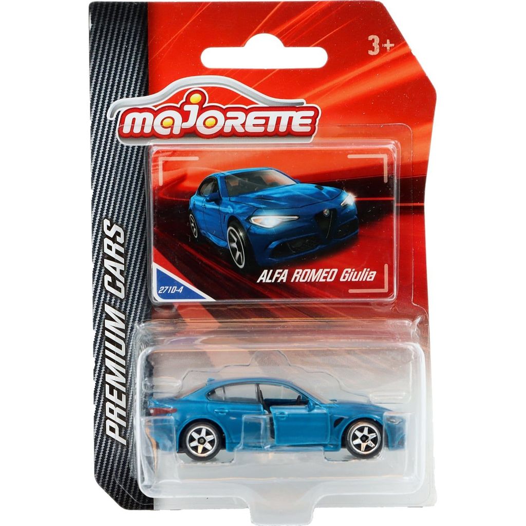 Alfa Romeo Giulia i en flot metalblå farve. Bilen er fra Majorette og Premium Cars-serien. Bilen er ca. 7,5 cm lang (skala 1:60).