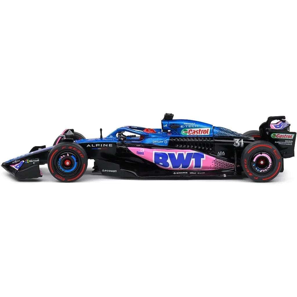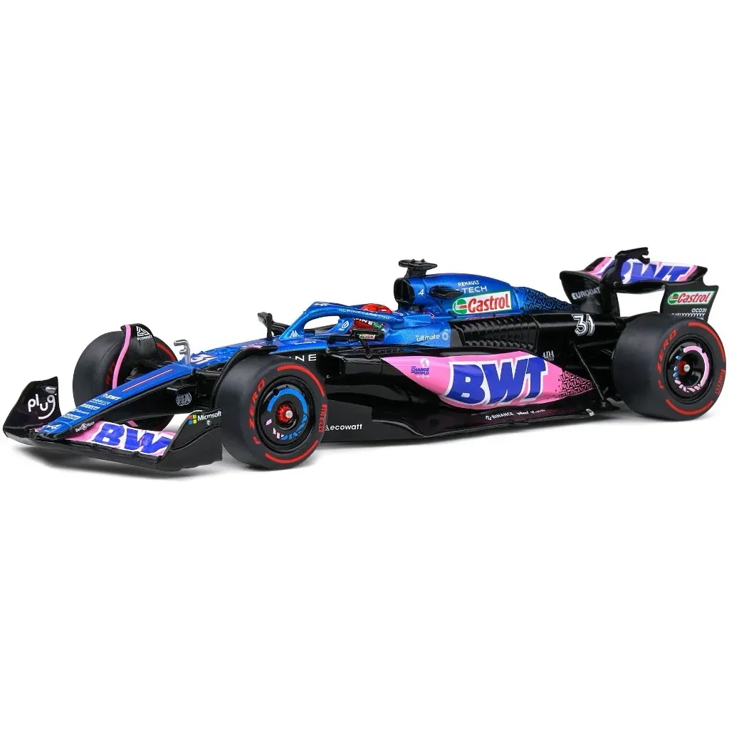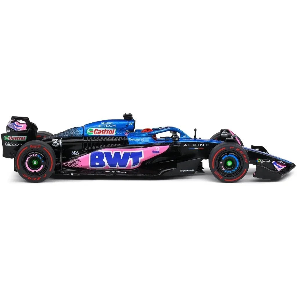 Model af A523 Formel 1-bilen fra Alpine fremstillet af Solido i skala 1:43 (13 cm). Netop denne bil, med denne bemaling og nummer 31, blev kørt under Monacos GP i 2023 af Esteban Ocon.
