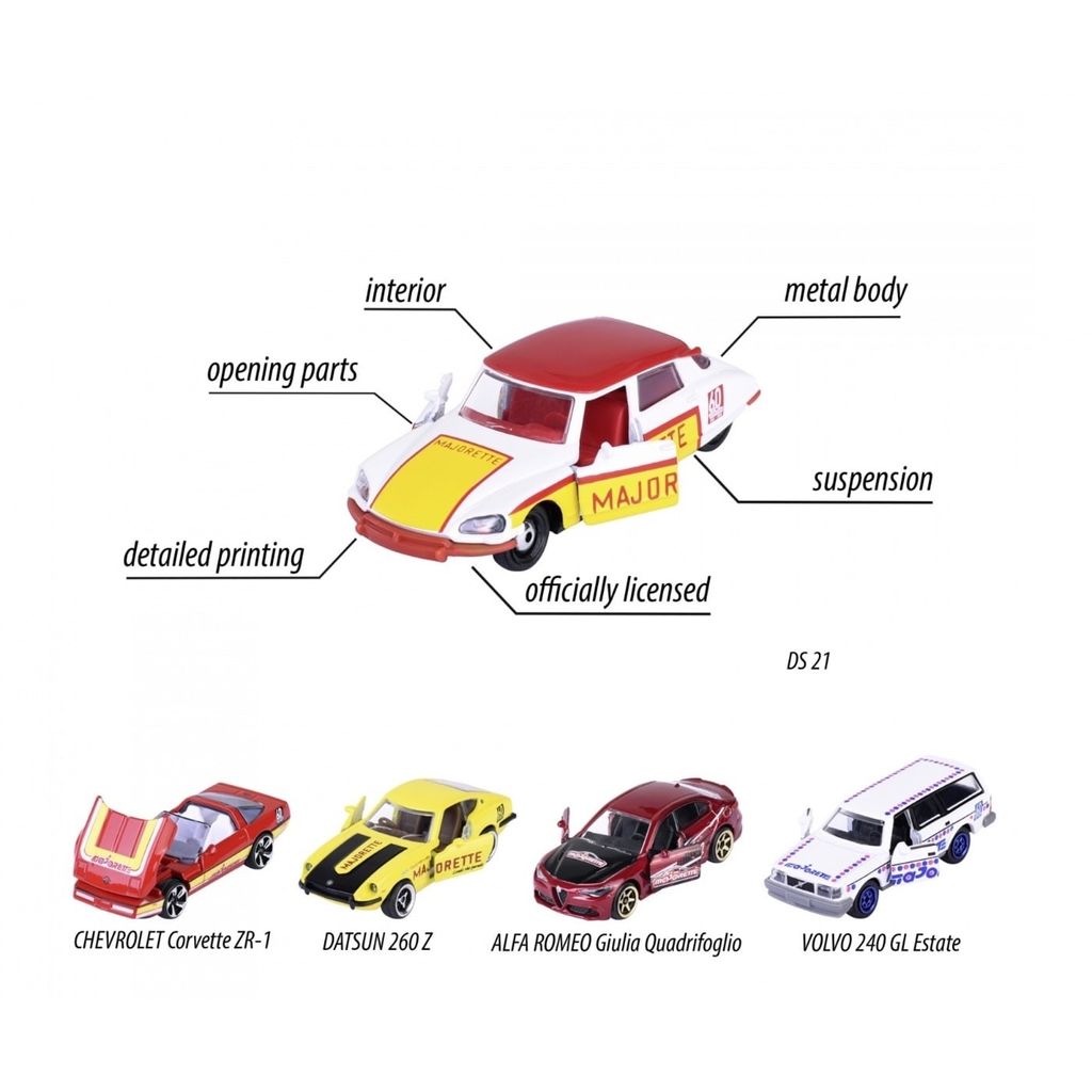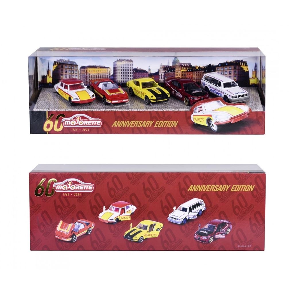 Sæt med fem legetøjsbiler i gaveæske. Bilerne er lavet af Majorette og er ca. 7,5 cm lange. Sættet hedder Anniversary Edition og blev udgivet i 2024 i anledning af Majorettes 60-års jubilæum (1964-2024).