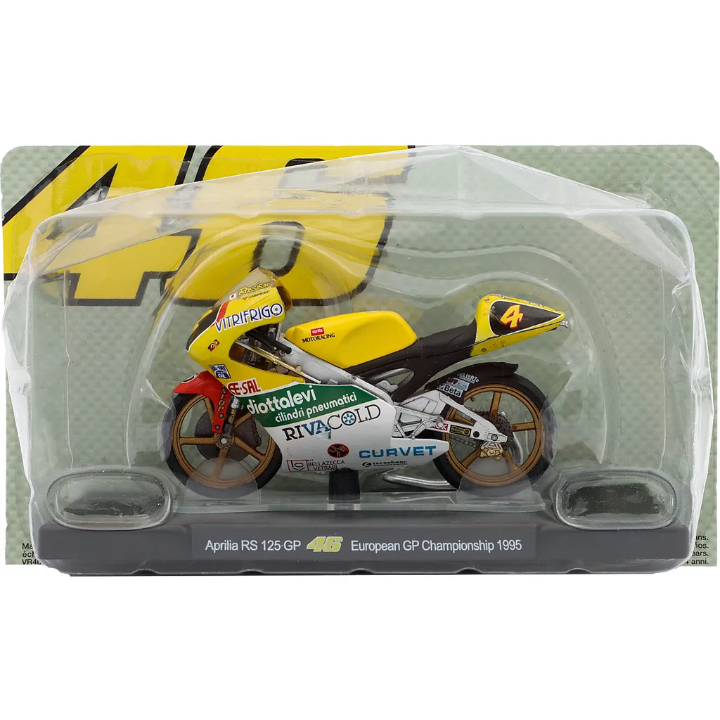 Motorcyklen står på en sort bundplade med teksten "Aprilia RS 125 GP 46 European GP Championship 1995".