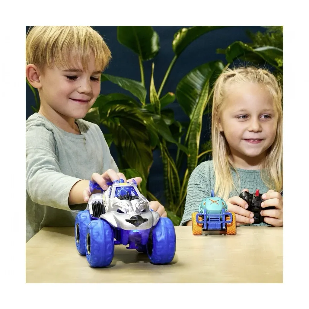 Det sølvfarvede monster truck har store blå, bløde gummidæk.