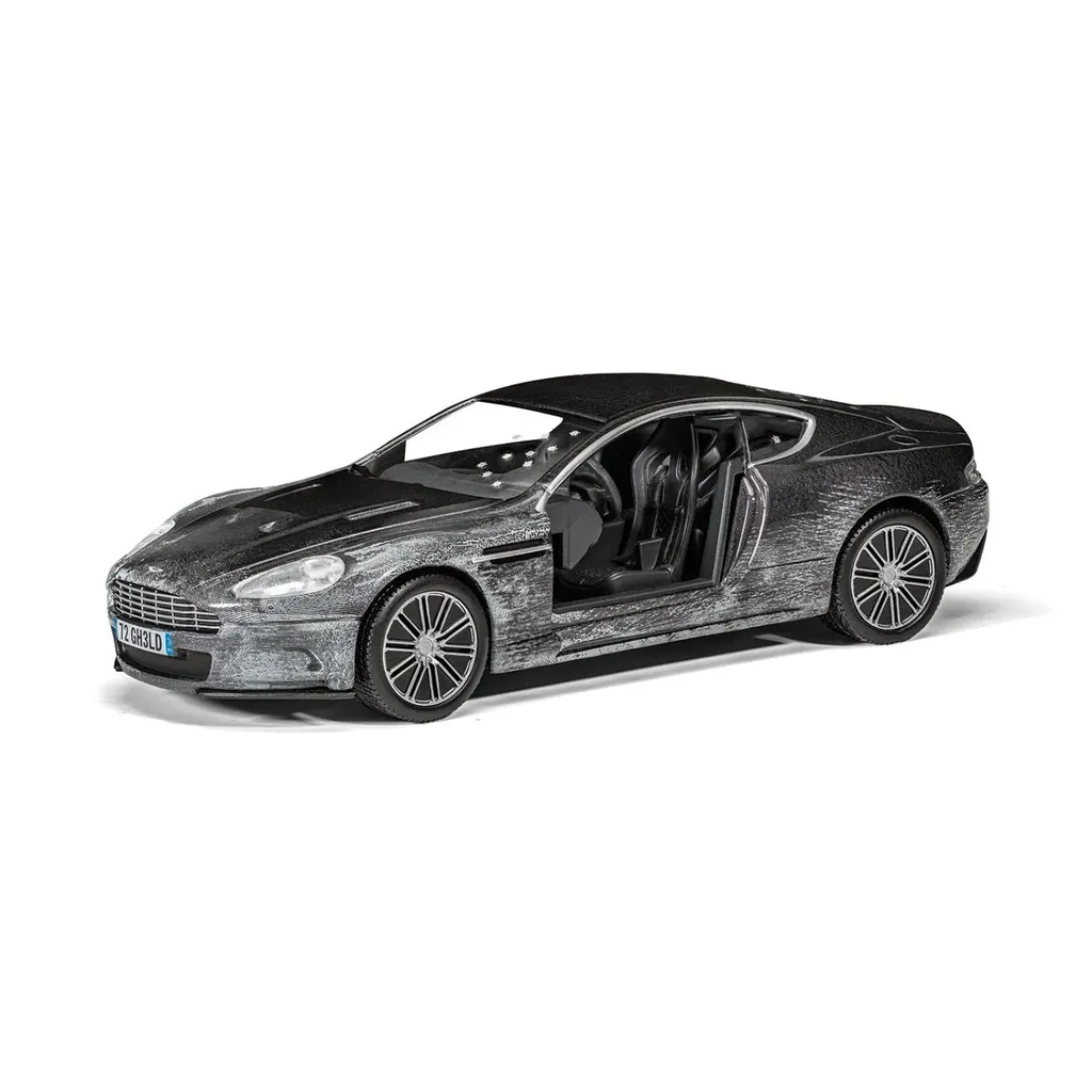 Sølvfarvet Aston Martin DBS kørt af James Bond i filmen Quantum of Solace (2008). Bilen er i skala 1:36 (13 cm).