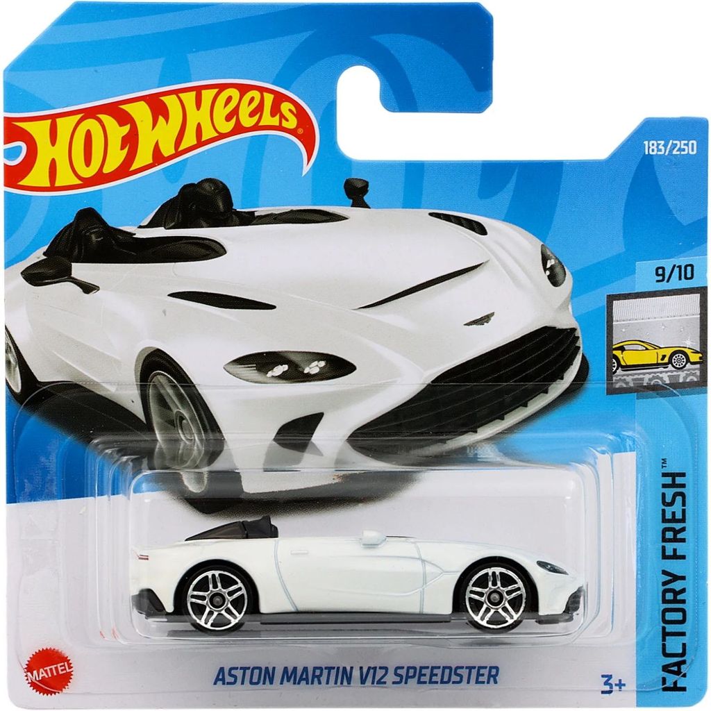 Aston Martin V12 Speedster fra Hot Wheels og Factory Fresh-serien, hvor denne legetøjsbil er bil nummer 9/10. Bilen er nummer 183/250 fra 2022 og har et kort kort (5785).