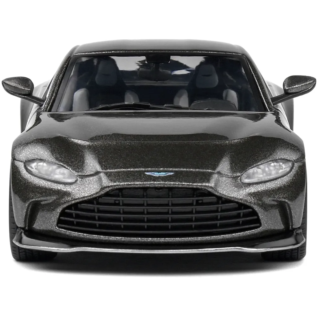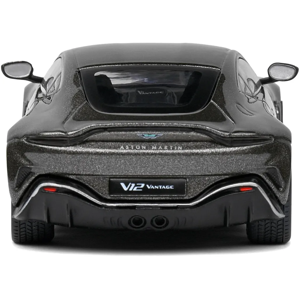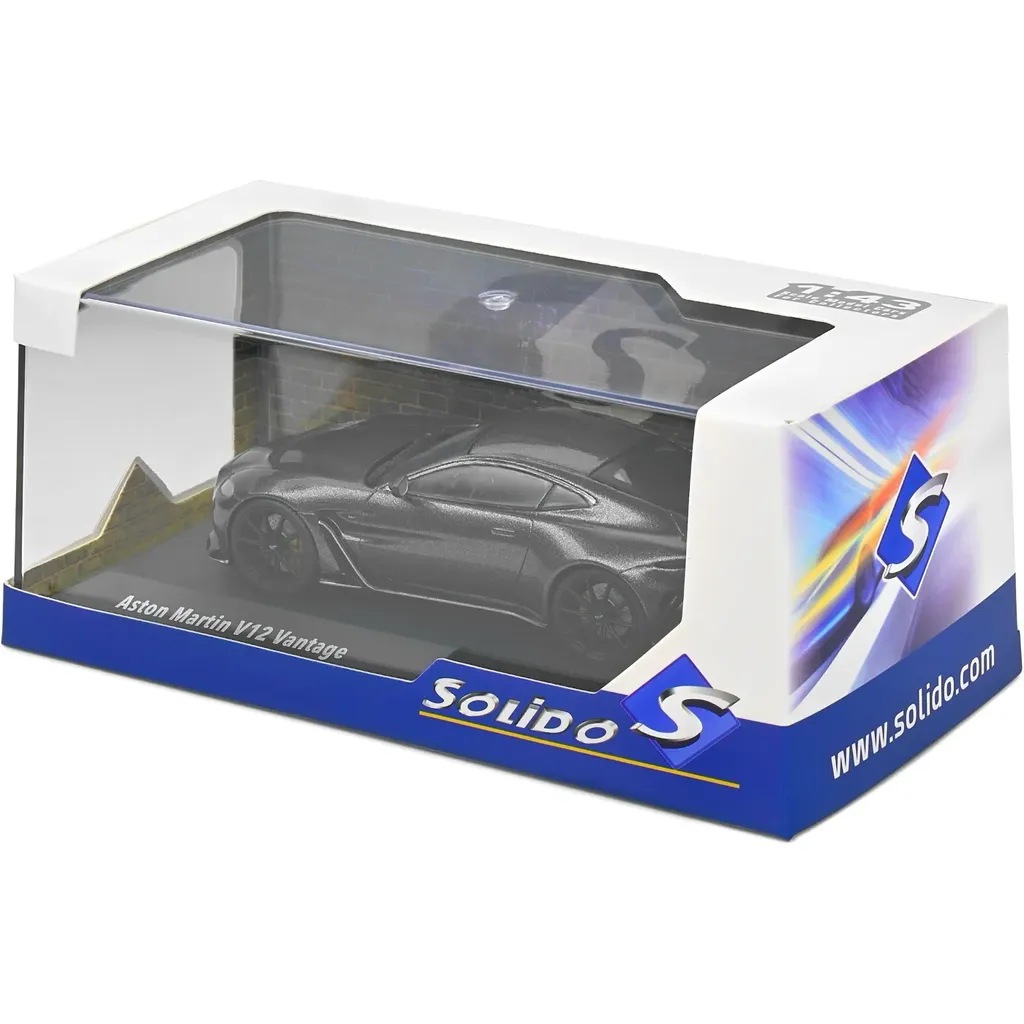 Aston Martin V12 Vantage, modelår 2023, som modelbil fra franske Solido i skala 1:43 (11 cm). Sportsvognen er gråmetallic (Cumberland Grey) med sorte fælge.