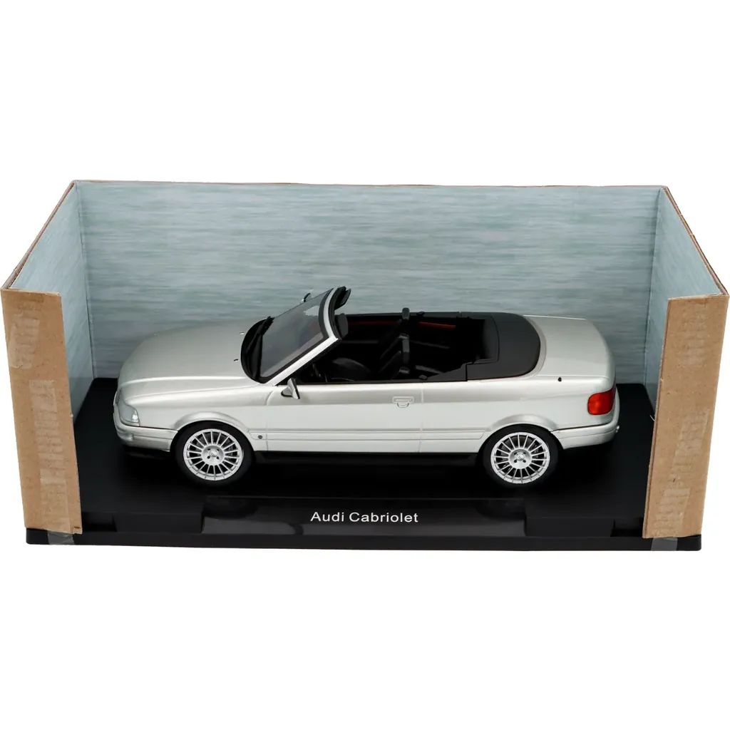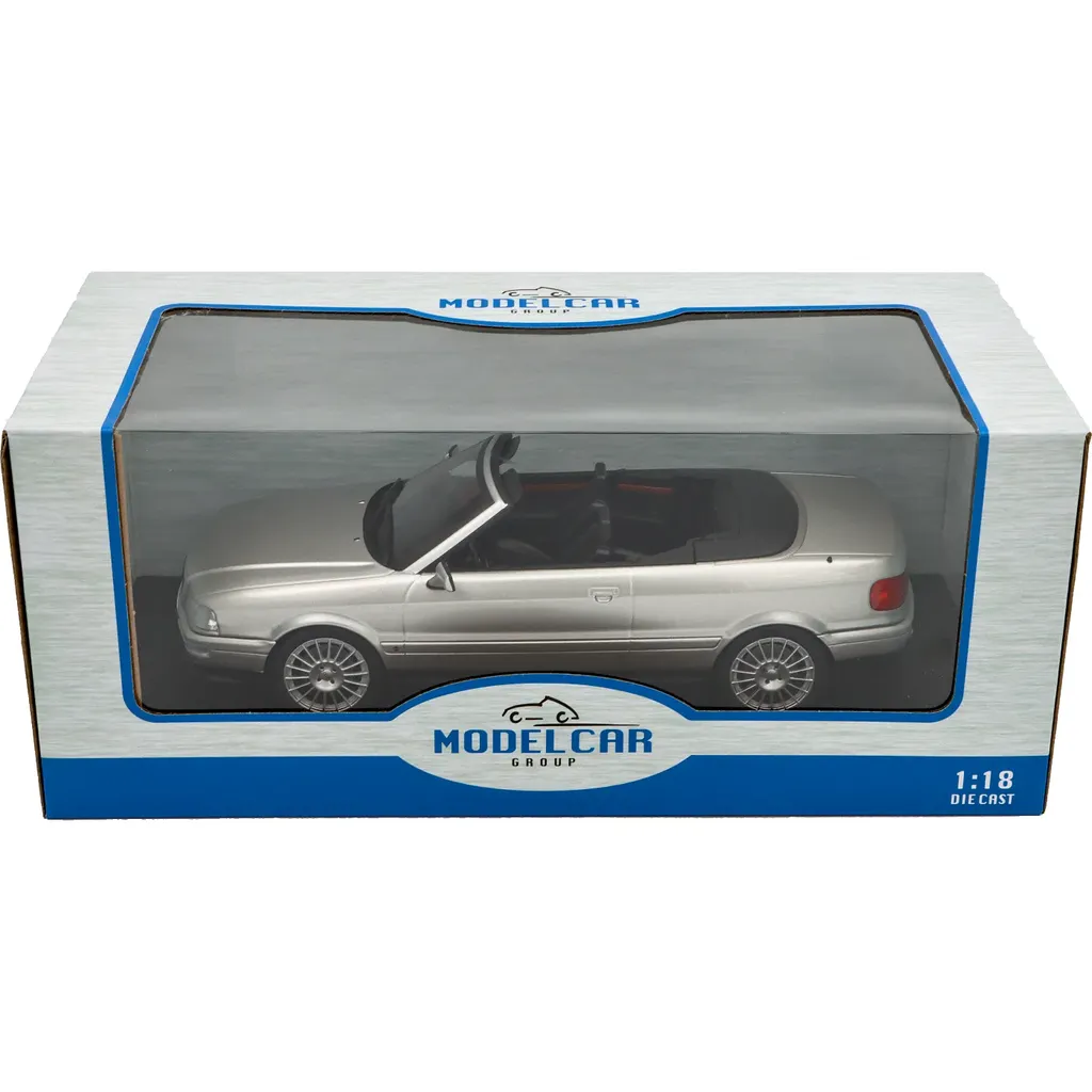 Silvermetallic Audi Cabriolet (8G), som er baseret på modelbilen Audi B3 Coupé fra den tyske Modelcar Group. Modellen er i skala 1:18 (24 cm).
