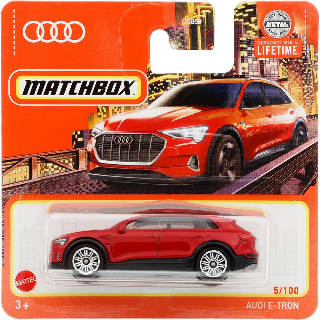 Rød Audi E-Tron, hvor denne bil er bil nummer 5/100 i Matchbox-serien.