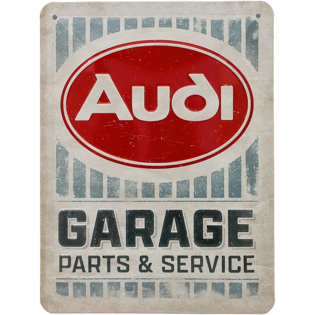 Metalplade med Audi-logo og teksten "Audi - Garage - Parts & Service".