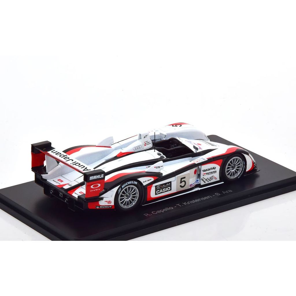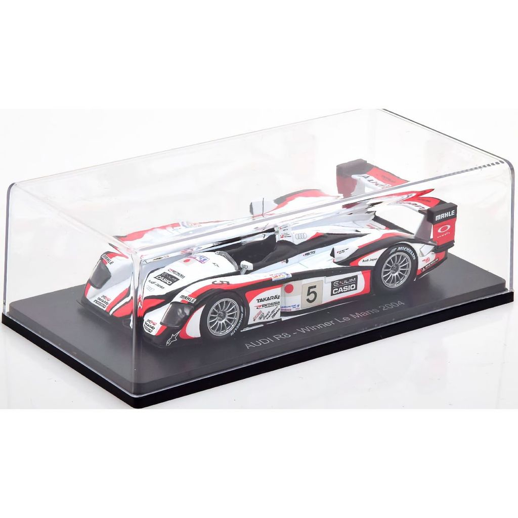 Denne modelbil i skala 1:43 fra Spark forestiller den Audi R8, der vandt det klassiske franske Le Mans-løb i 2004 efter at have kørt 379 omgange på 24 timer.