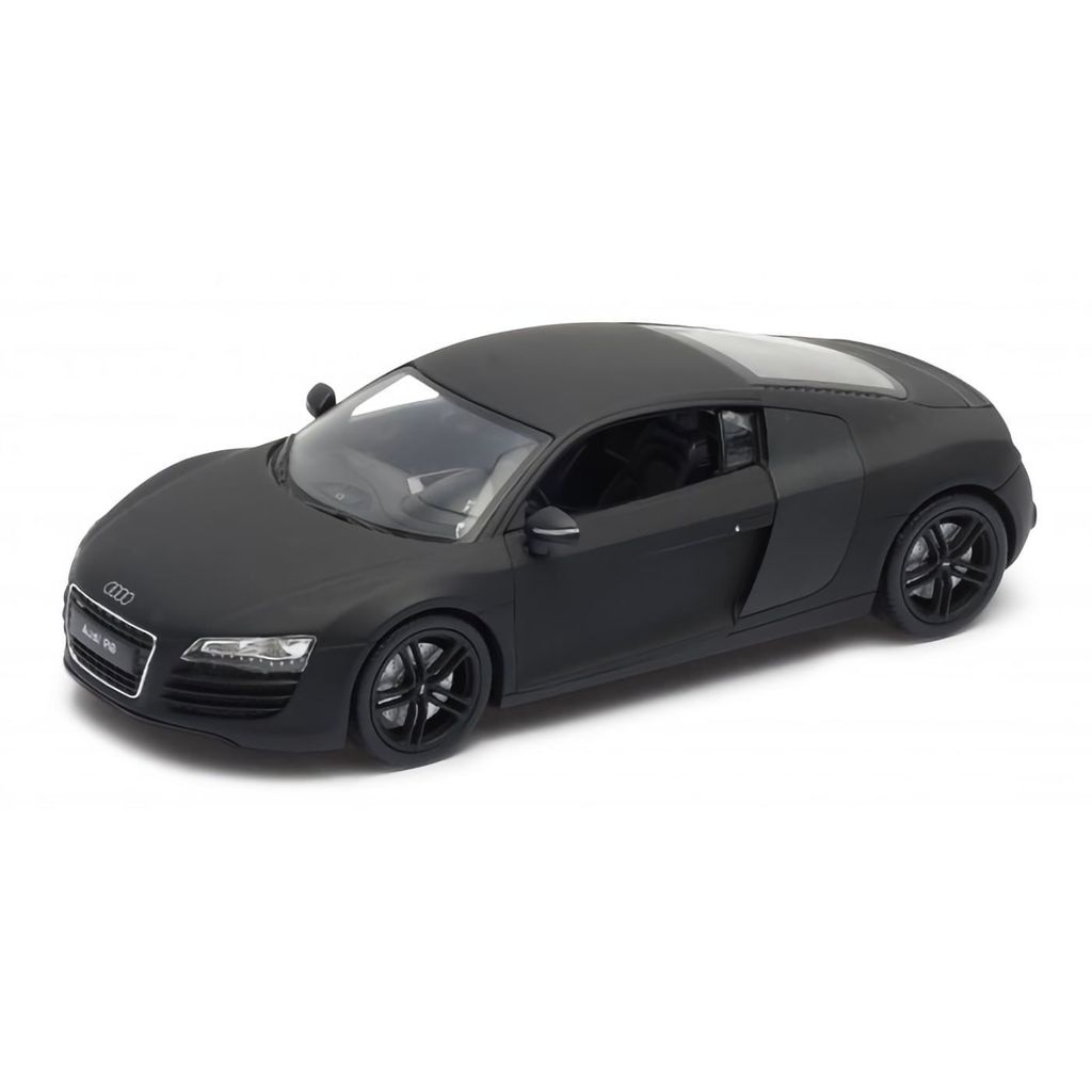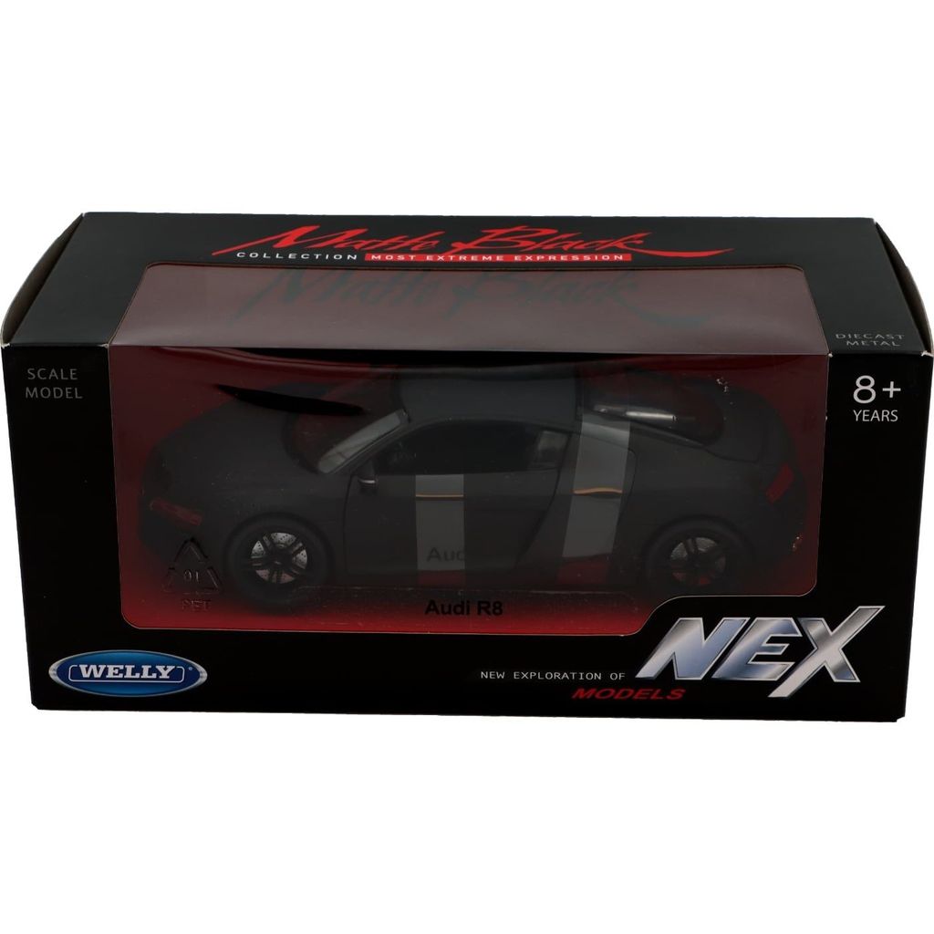 Matsort Audi R8 fra Welly i skala 1:24 (ca. 18 cm). Modellen er en del af Wellys serie "Matte Black Collection Most Extreme Expression".