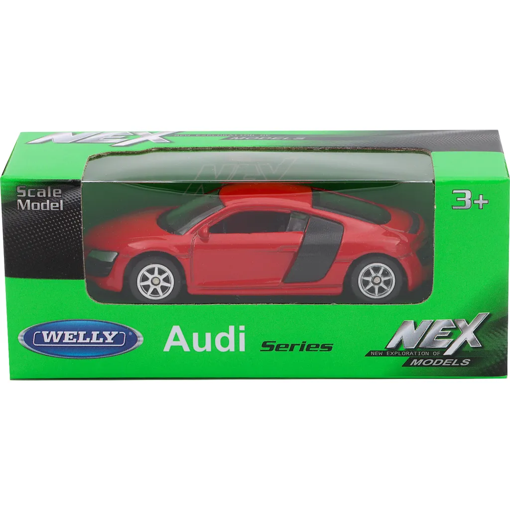 Rød Audi R8 V10, modelår 2010, som en lille (7 cm / skala 1:64) legetøjsbil fra Welly og deres Audi Series-sortiment.
