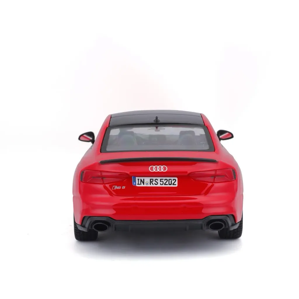 Rød Audi RS 5 Coupé, modelår 2019, som legetøjsmodel fra Bburago. Bilen er i skala 1:24 (19,7 cm) og har døre, der kan åbnes.