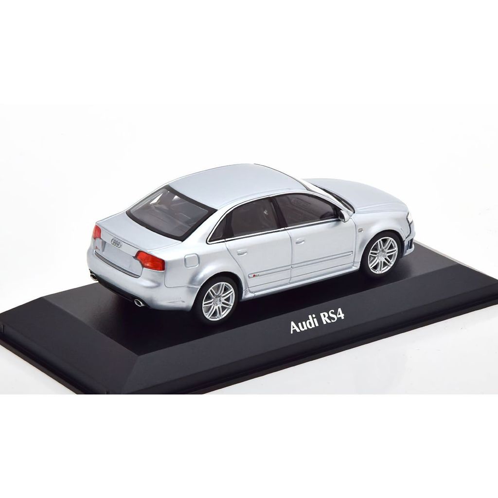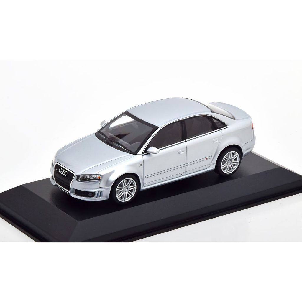 Audi RS4 i sølv fra 2004 som modelbil (skala 1:43) fra Minichamps og deres serie Maxichamps Collection.