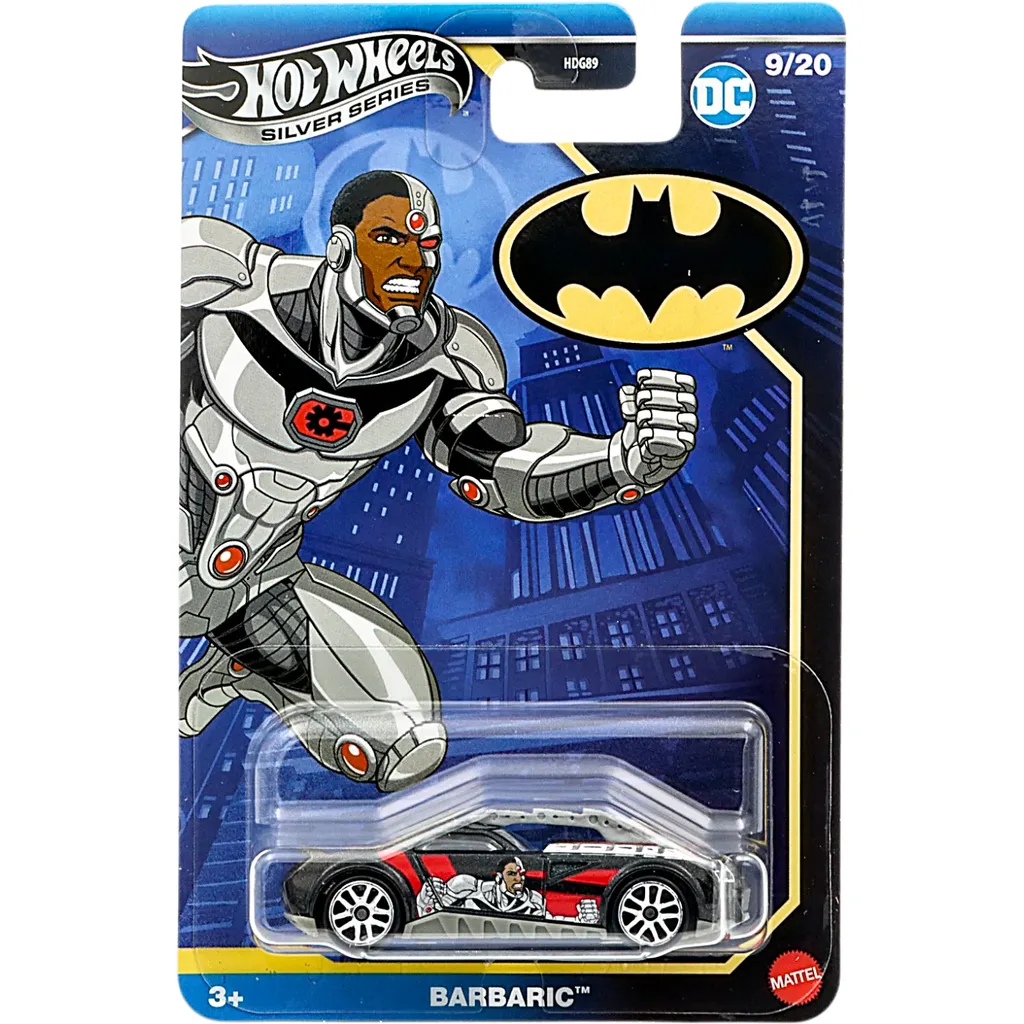 Metallisk sort Barbaric fra Hot Wheels og deres Batman-serie. Denne særlige bil er udgivet i 2025 og dekoreret med figuren Cyborg (Victor "Vic" Stone).