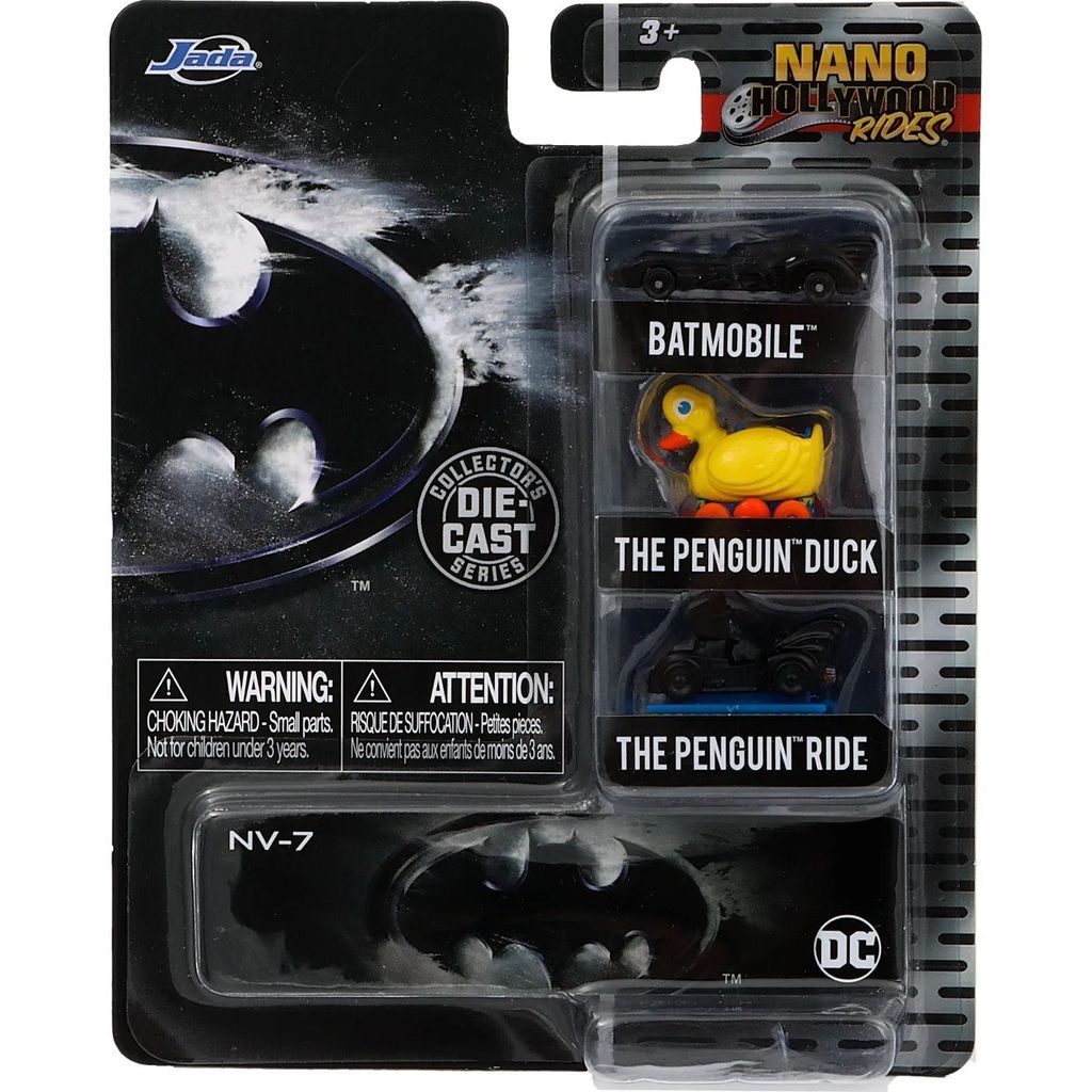 Sæt med 3 små køretøjer/nanobiler (2 biler og 1 and med hjul) fra Batman-filmene fra legetøjsproducenten Jada Toys, som producerer disse køretøjer på licens fra DC Comics og Warner Bros. Bilerne og anden, der følger med, er listet nedenfor og er en del af serien Nano Hollywood Rides, sæt NV-7, som egentlig er en serie for samlere, men køretøjerne fungerer selvfølgelig også godt som legetøj.