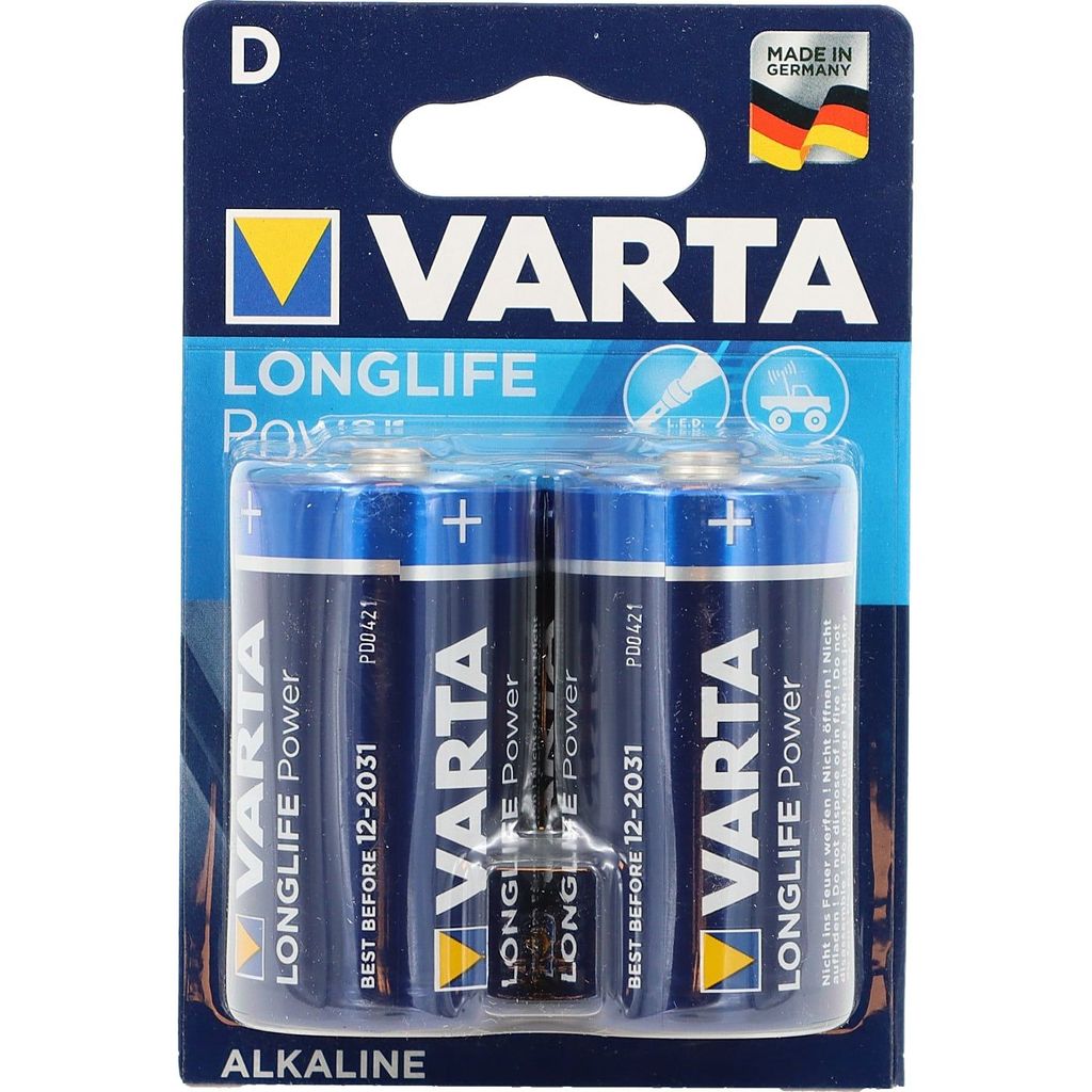 2-pak D-batterier (LR20) fra Varta. Vartas Longlife-serie giver pålidelig strøm til radiostyrede biler, legetøjsbiler, batterilegetøj og andre produkter i vores sortiment, som kræver strøm fra 1,5 volt D/LR20-batterier. Varta kalder også denne model for MN1300, Mono eller 4920.