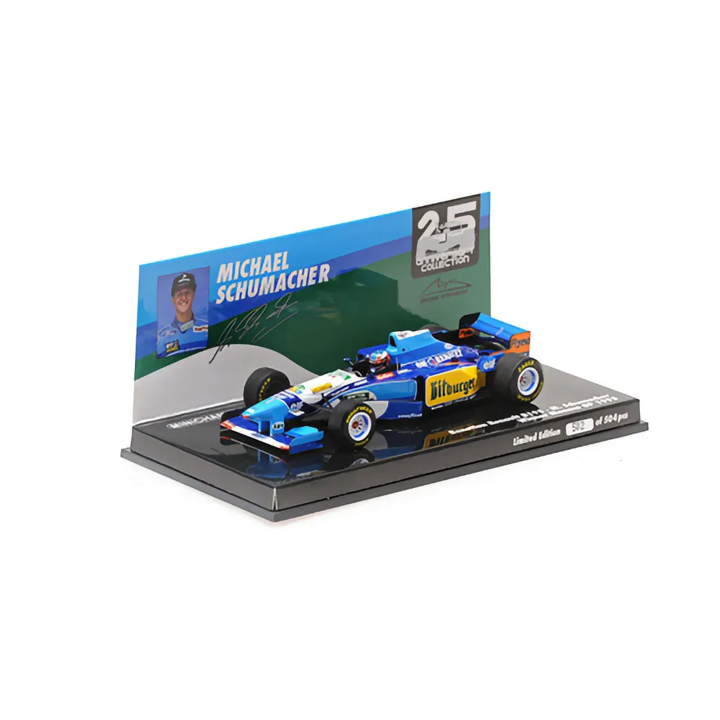 Michael Schumacher kørte i denne Benetton Renault B195, da han vandt Monacos Grand Prix i 1995. Modellen er produceret af tyske Minichamps i skala 1:43 (10,5 cm).