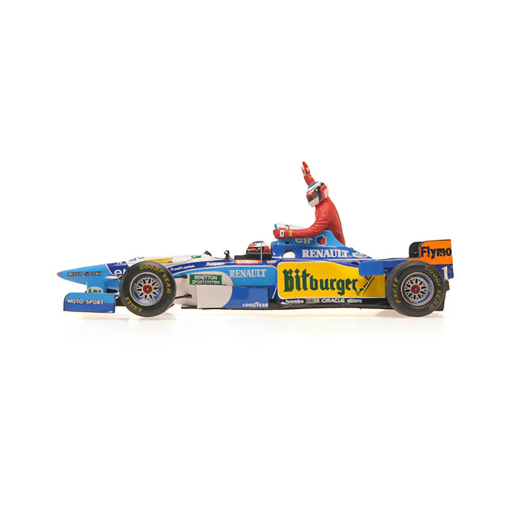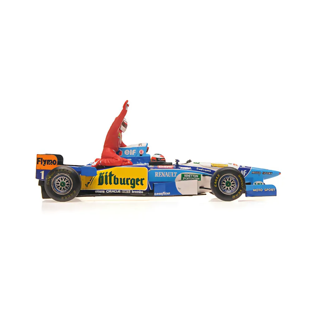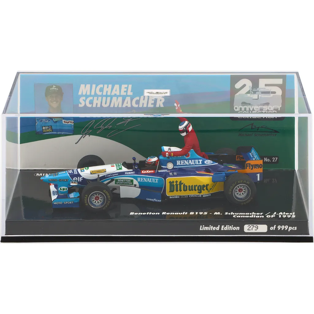 Michael Schumacher kørte denne Benetton Renault B195 under Canadas Grand Prix i 1995. Løbet blev vundet af hans holdkammerat Jean Alesi, som her bliver kørt af Michael. Modellen er lavet af tyske Minichamps i skala 1:43 (10,5 cm).
