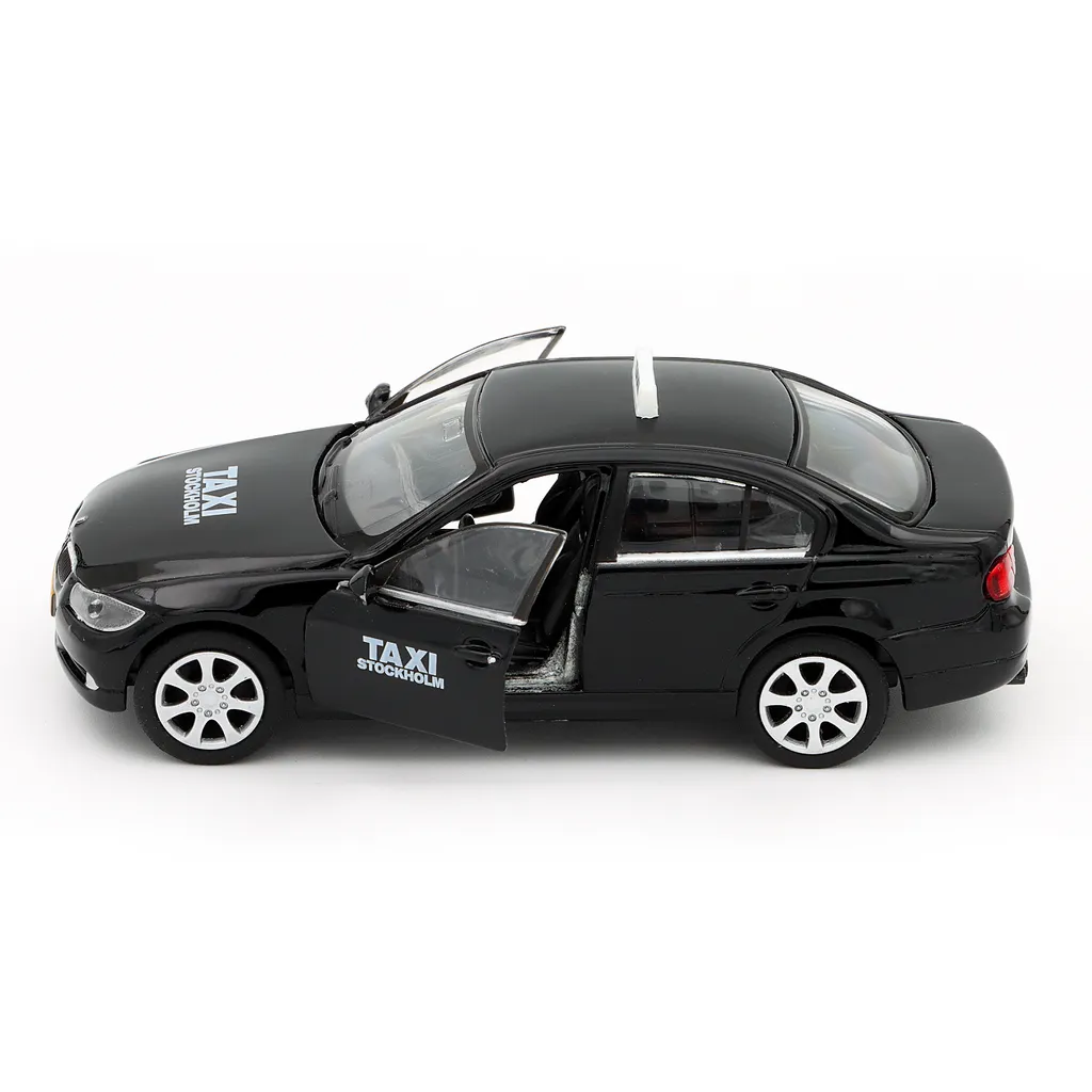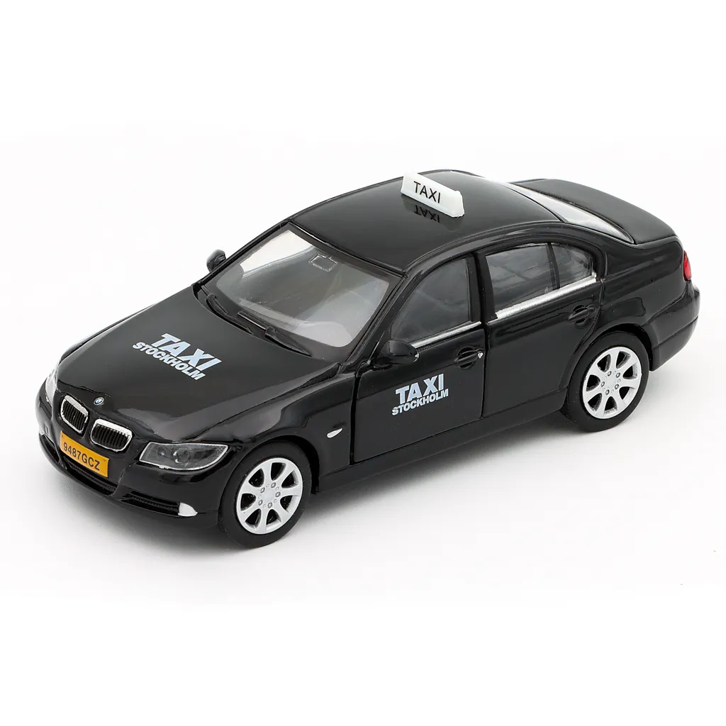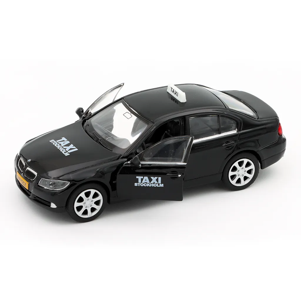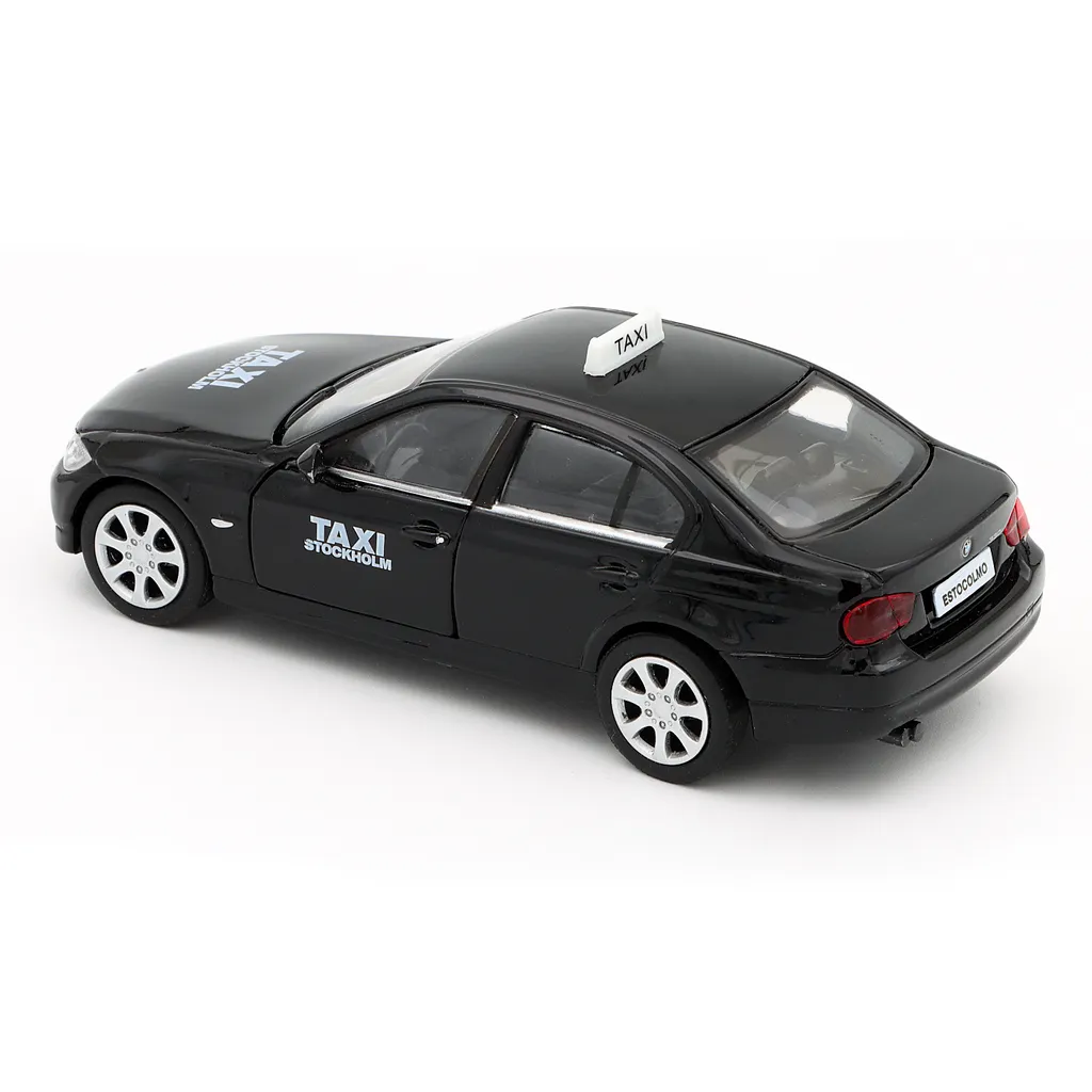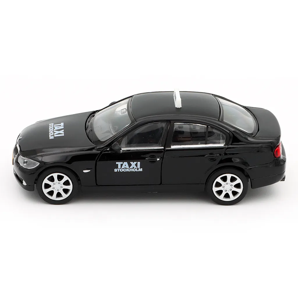 BMW 318i som taxa (Taxi Stockholm) lavet af Welly i metal. Skalaen er 1:38, så denne taxa er 12 cm lang i dette modelformat.