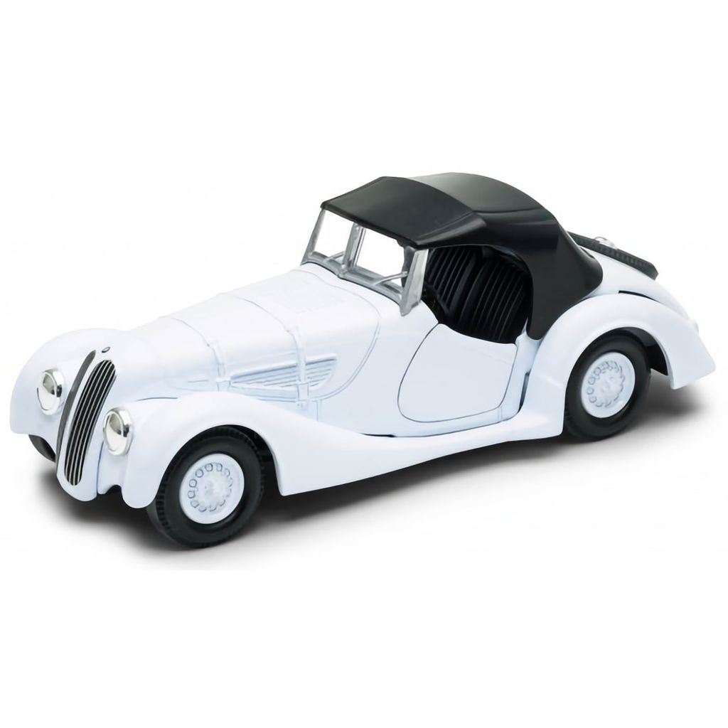 Denne model og legetøjsbil af BMW 328 har døre, der kan åbnes, og en motor, der kan trækkes tilbage. Vælg, om du vil have den røde bil med åbent tag eller den hvide bil med lukket tag.