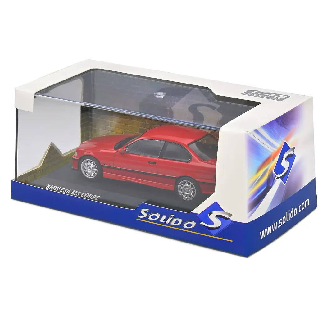 BMW E36 M3 Coupé, modelår 1999, som modelbil fra franske Solido. Modellen er lavet i skala 1:43, som for denne model er 10,5 cm BMW M3. Farven er rød (Brilliant Red).
