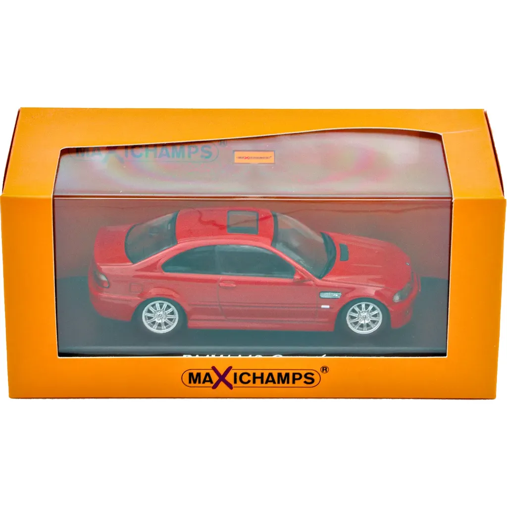 Rød BMW M3 (E46) Coupé, modelår 2021. Modelbilen er fremstillet af Maxichamps i skala 1:43 (10,5 cm).