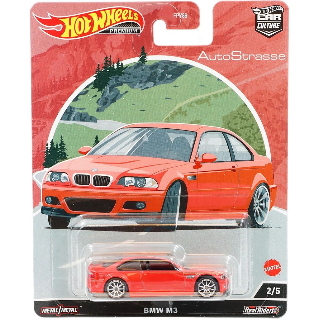 Rød BMW M3 (E46) fra Hot Wheels. Bilen er en del af Car Culture: AutoStrasse-sættet fra 2022, hvor denne M3 er bil nummer 2 ud af 5.