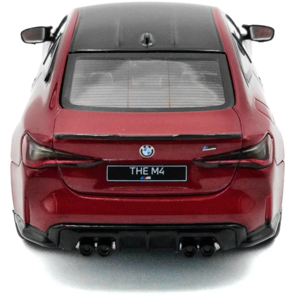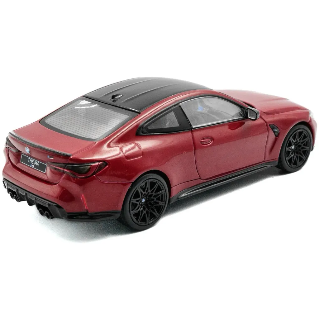 BMW M4 (G82) Competition, modelår 2023, som modelbil i skala 1:43 (11 cm) fra Solido. Farven er rød (Imola Red).