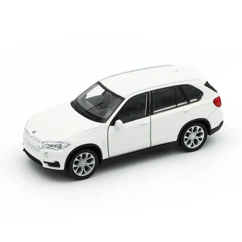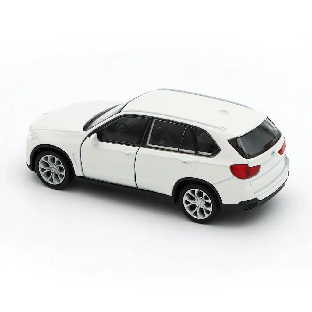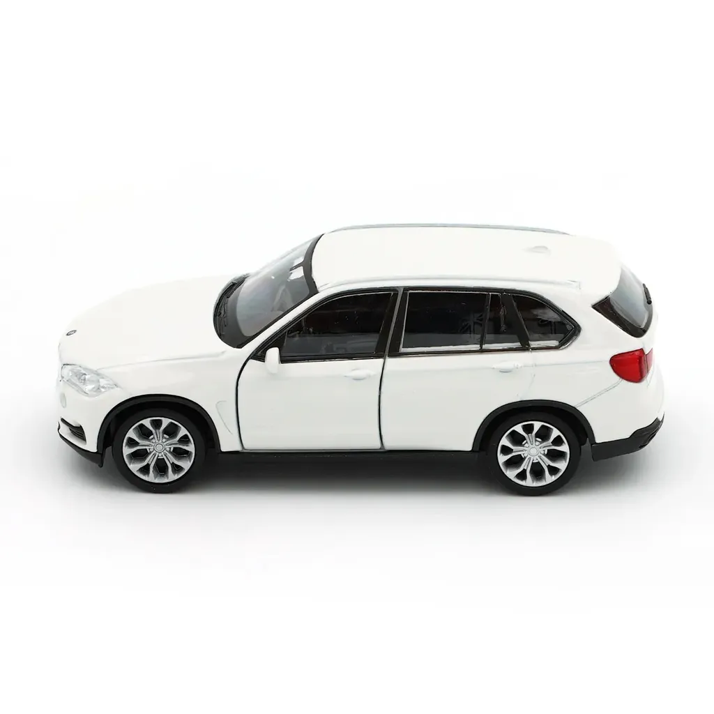 Hvid BMW X5, modelår 2015, fra Welly, med fordøre, der kan åbnes. Bilen er 11 cm (skala ca. 1:34-1:39).