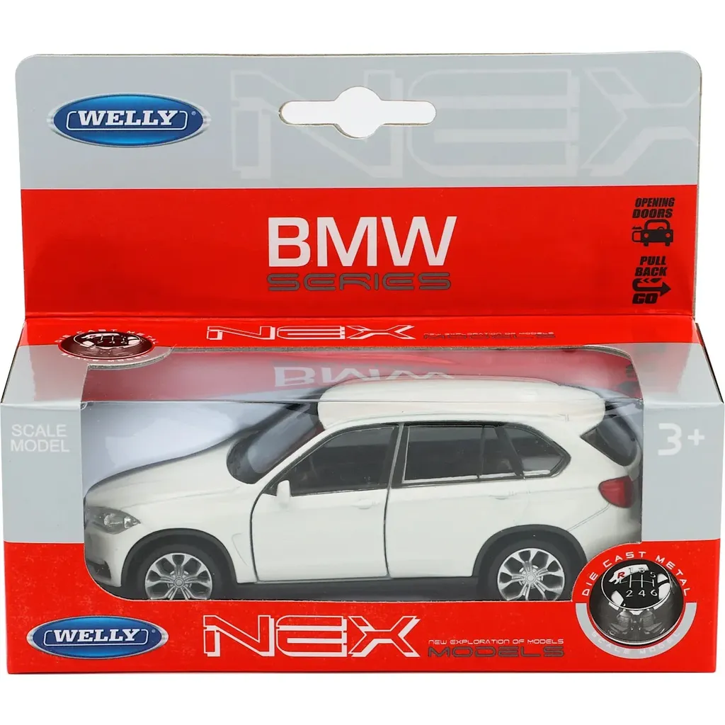 Hvid BMW X5, modelår 2015, fra Welly. Fordørene kan åbnes. Bilen er 11 cm (skala ca. 1:34-1:39).