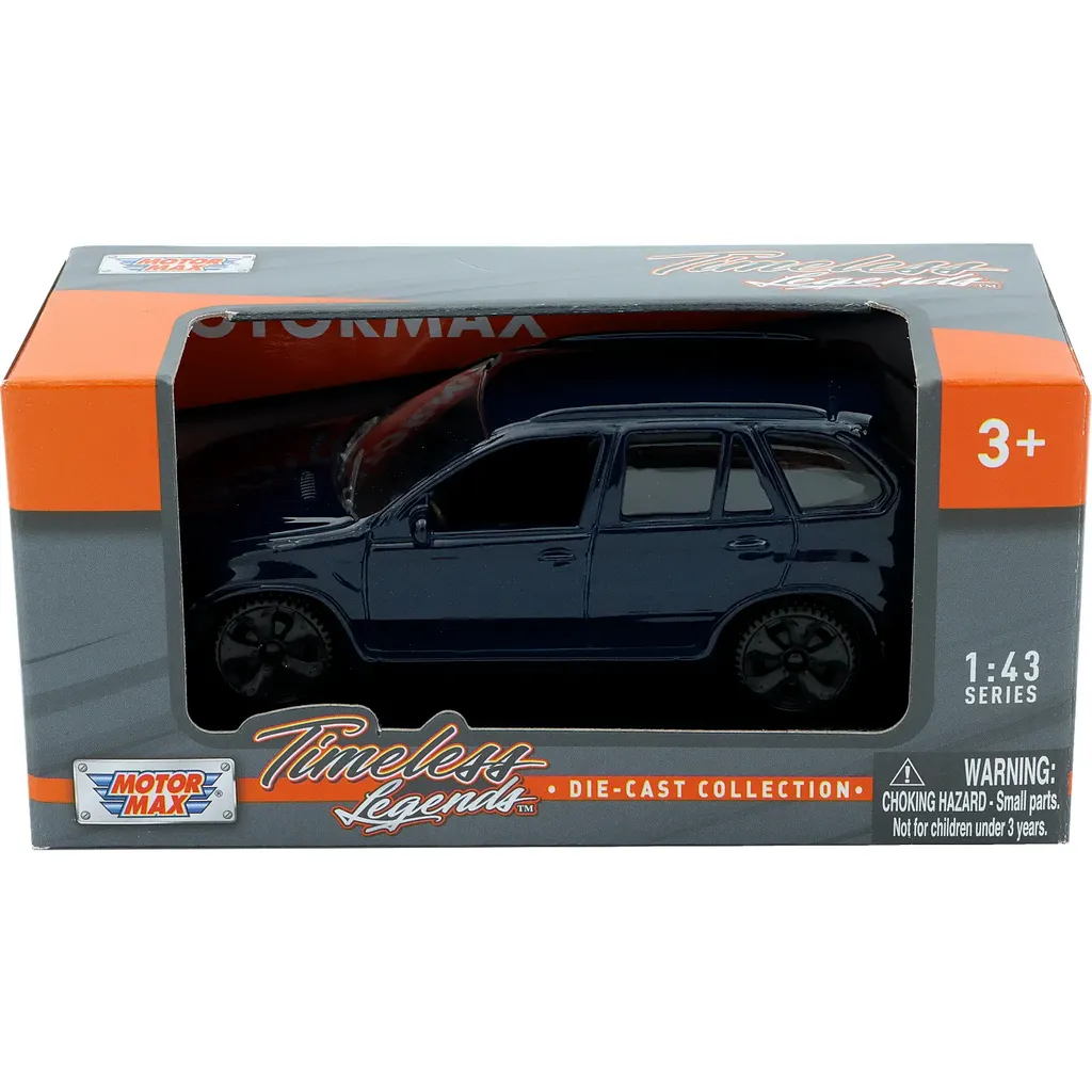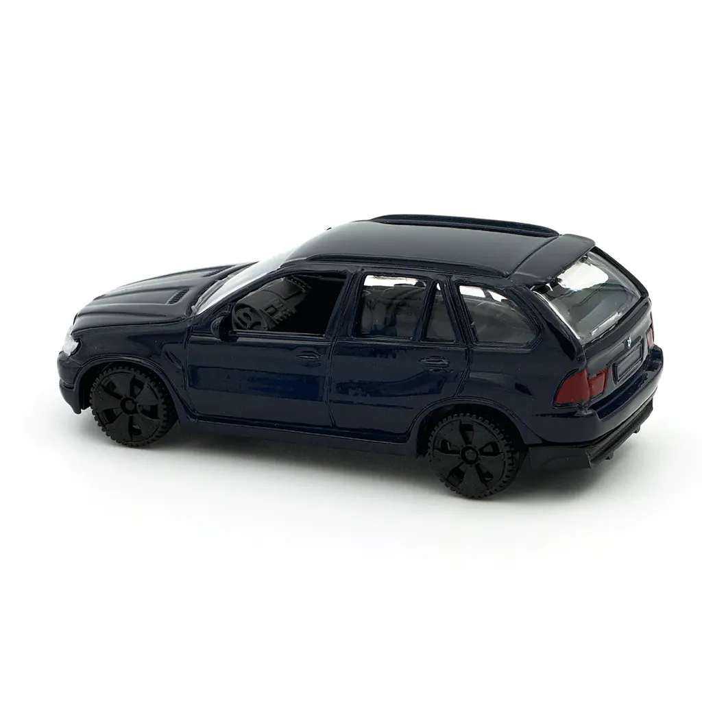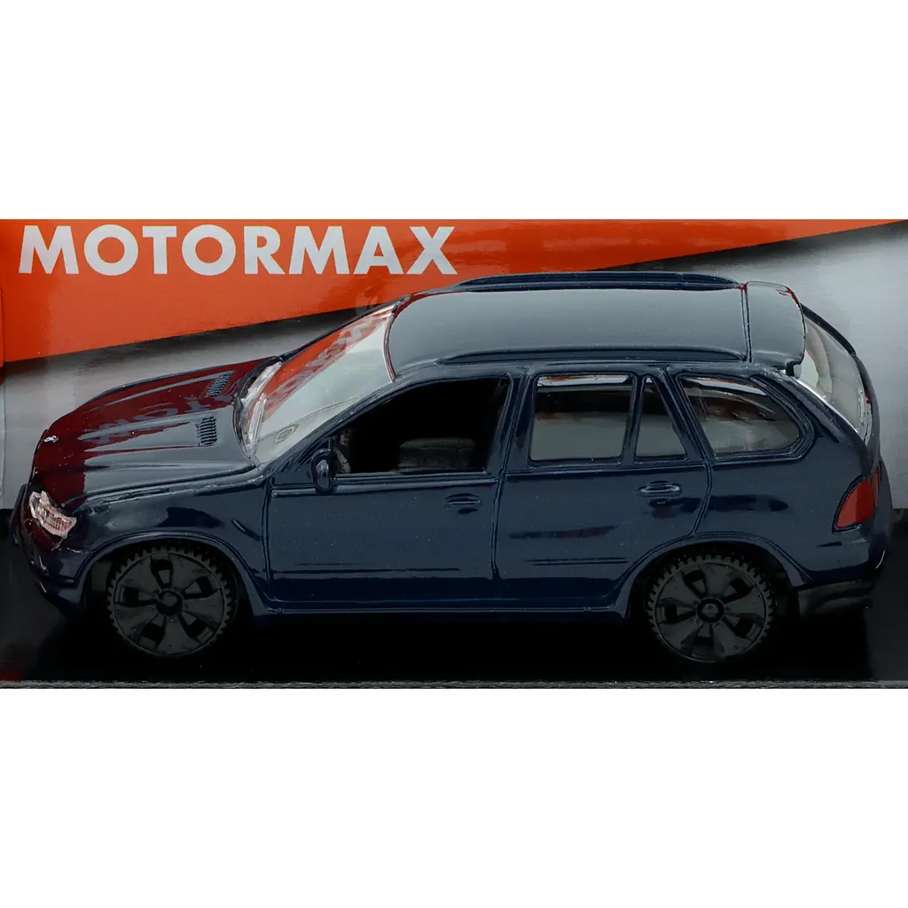 BMW X5 i mørkeblå som legetøjsbil fra Motormax. Bilen er 11 cm lang (omtrentlig skala 1:43).