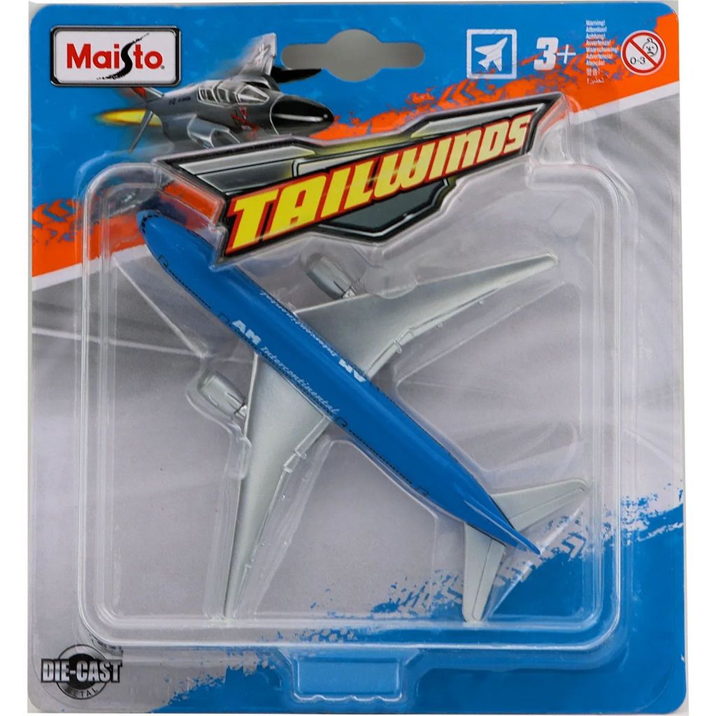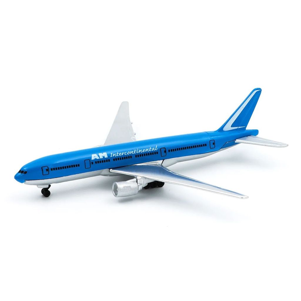 En blå Boeing 777-200 fra flyselskabet AM Intercontinental som legetøjsfly fra Maisto.