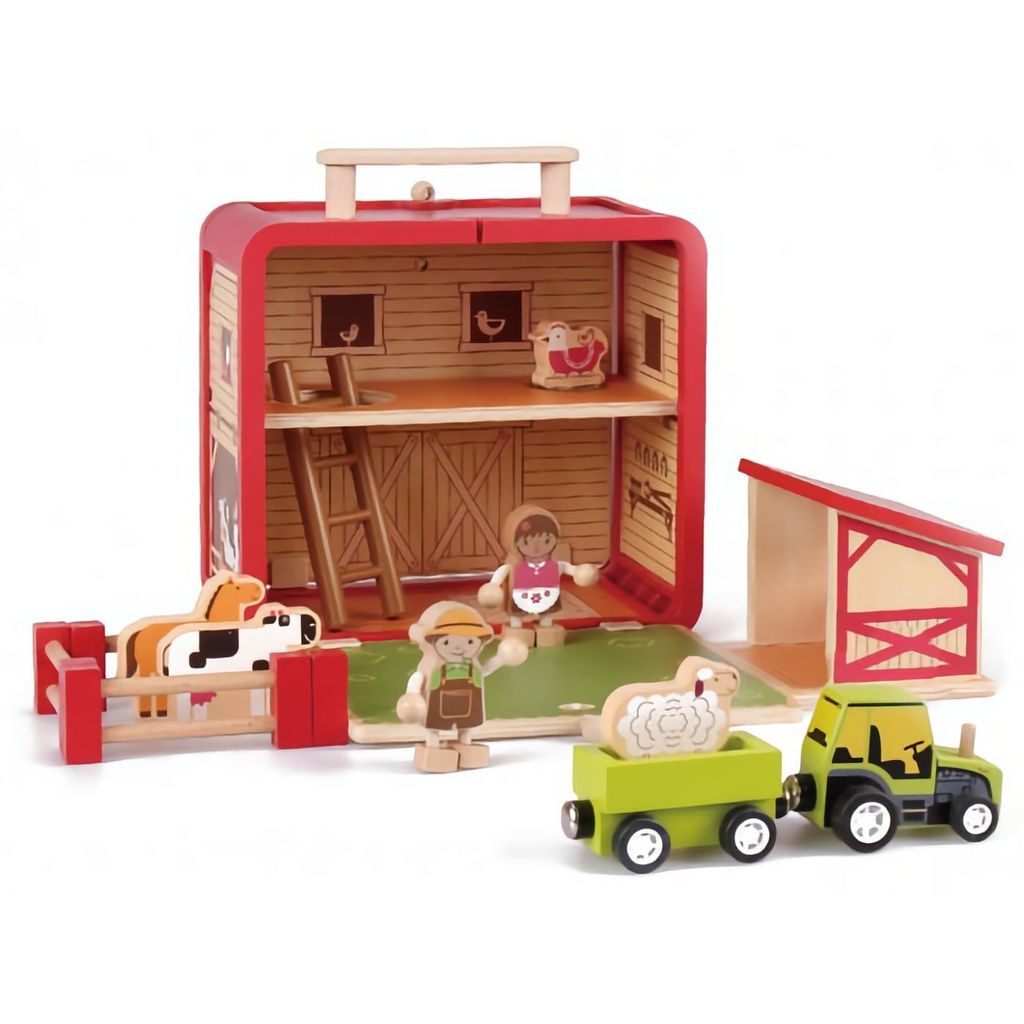 Bondgård i trä med djur och traktor