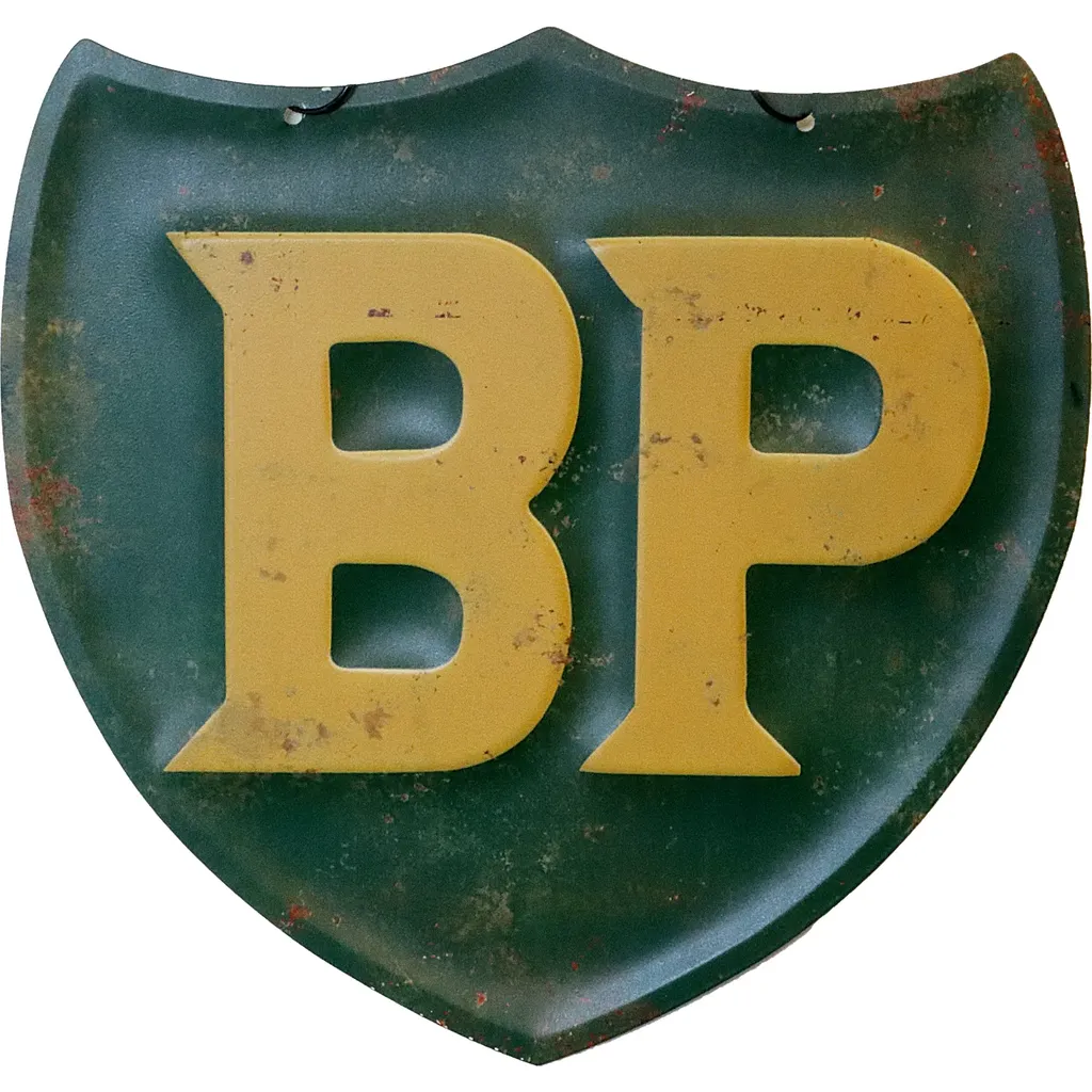 BP-logo som metalskilt. Skiltet er 30 cm bredt og 29 cm højt.
