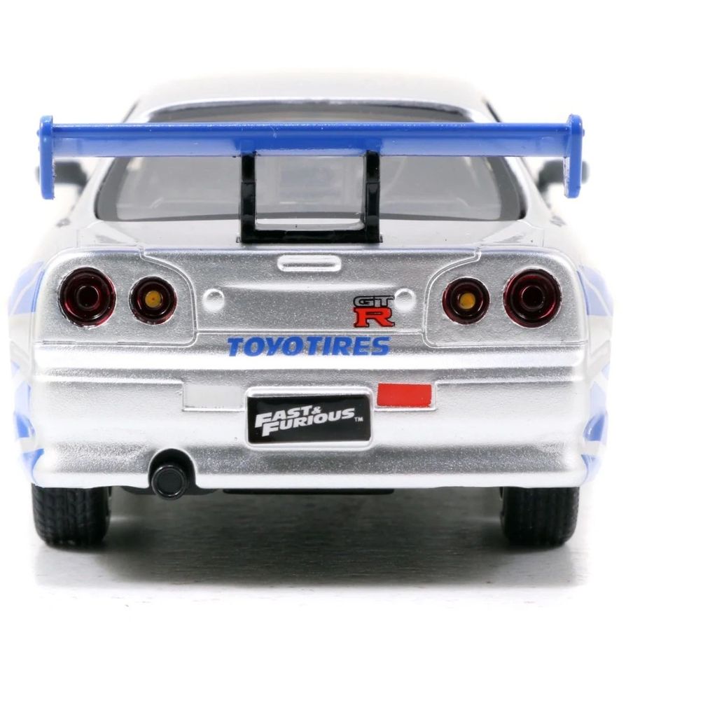 To biler fra Fast & Furious-filmene lavet af Jada Toys. Bilerne er Brian’s Nissan Skyline GT-R (BNR34) i to farver, sølv og blå.