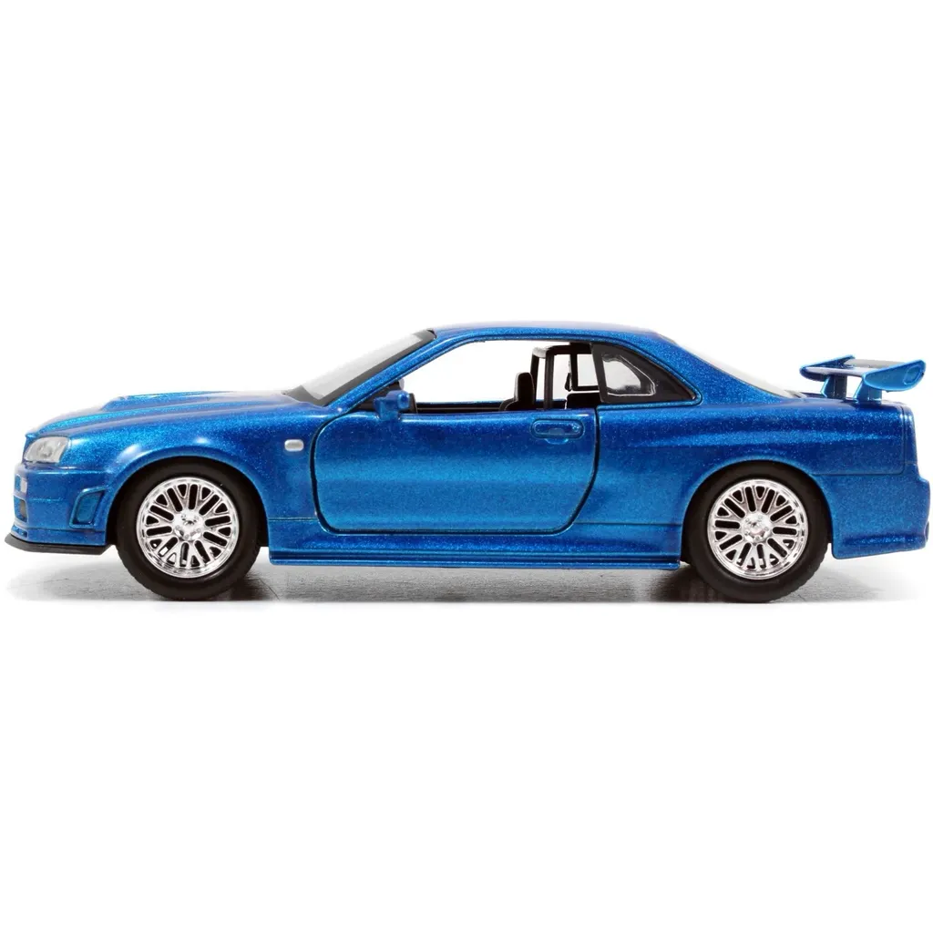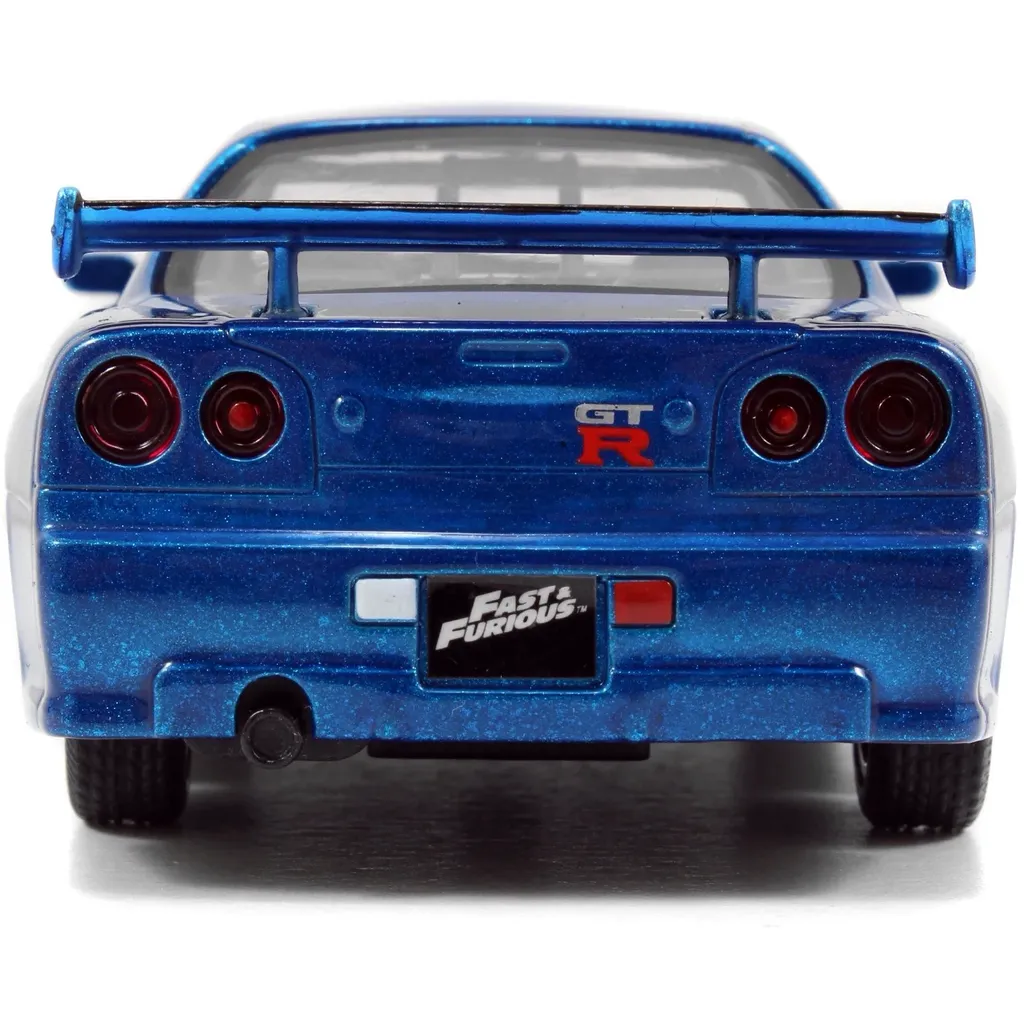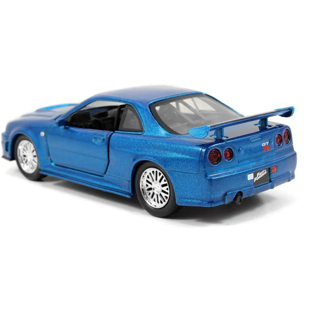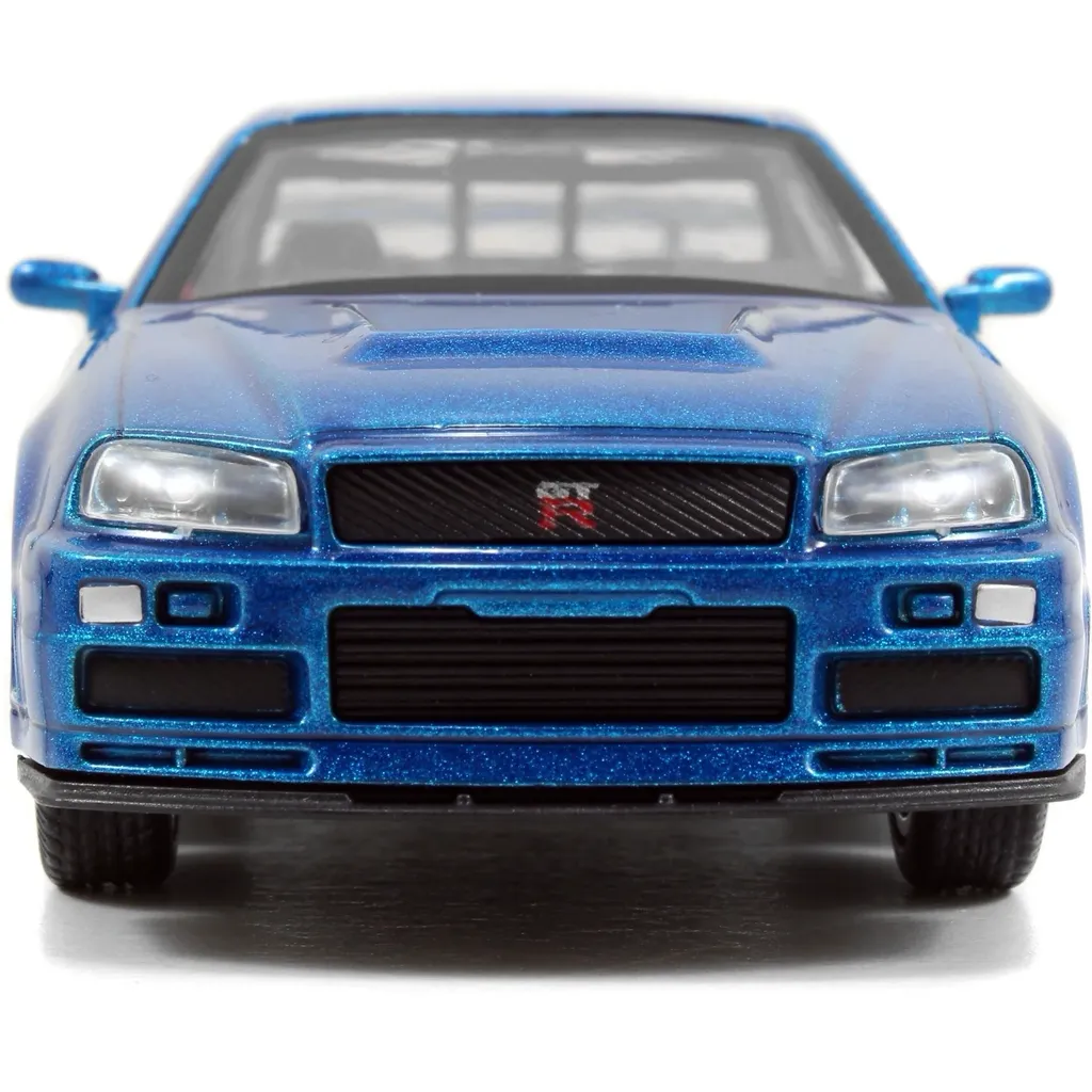 Brians blå Nissan Skyline GT-R (R34), modelår 1999, kendt fra Fast & Furious som model- og legetøjsbil fra Jada Toys i skala 1:32 (længde 13,5 cm).