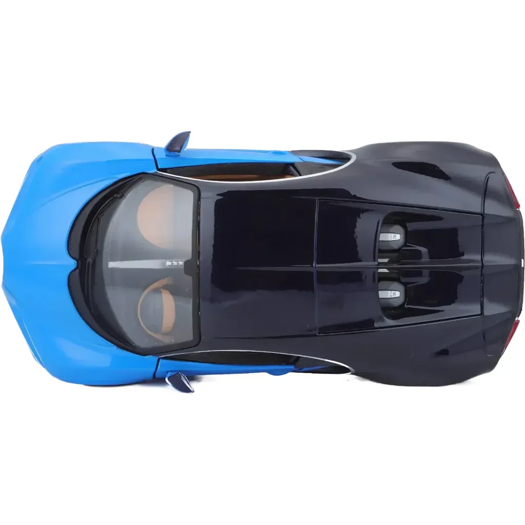 Blå Bugatti Chiron legetøjsmodel fra Maisto. Bilen er i skala 1:24 (18,9 cm) og har døre, der kan åbnes.