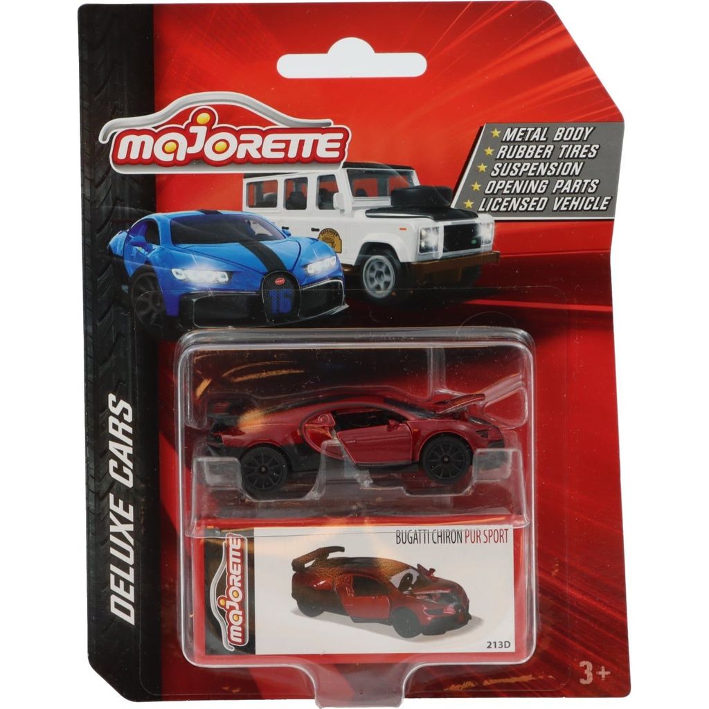 Bourgognefarvet Bugatti Chiron Pur Sport fra Majorette og Deluxe Cars-serien. Bilen er ca. 7,5 cm lang.