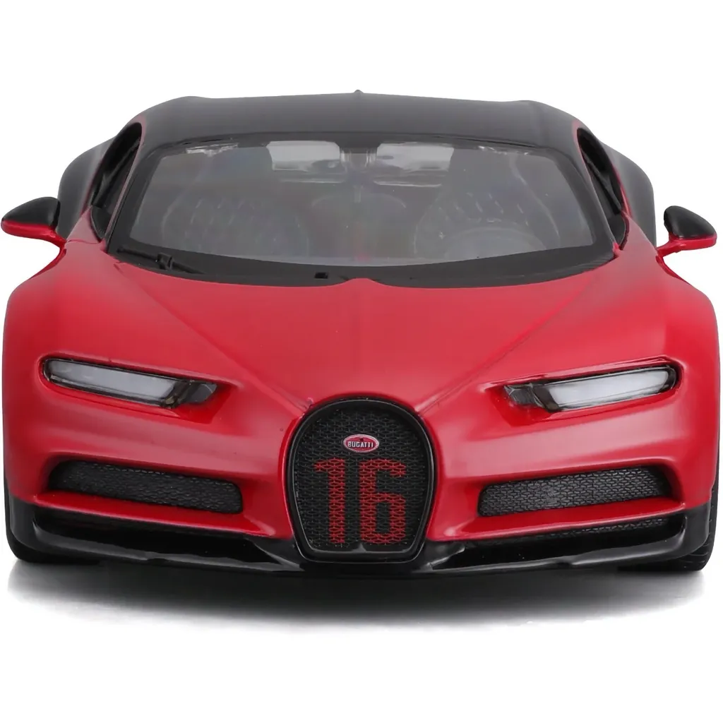 Rød og sort Bugatti Chiron Sport legetøjsmodel fra Maisto. Bilen er i skala 1:24 (19 cm) og har døre, der kan åbnes.