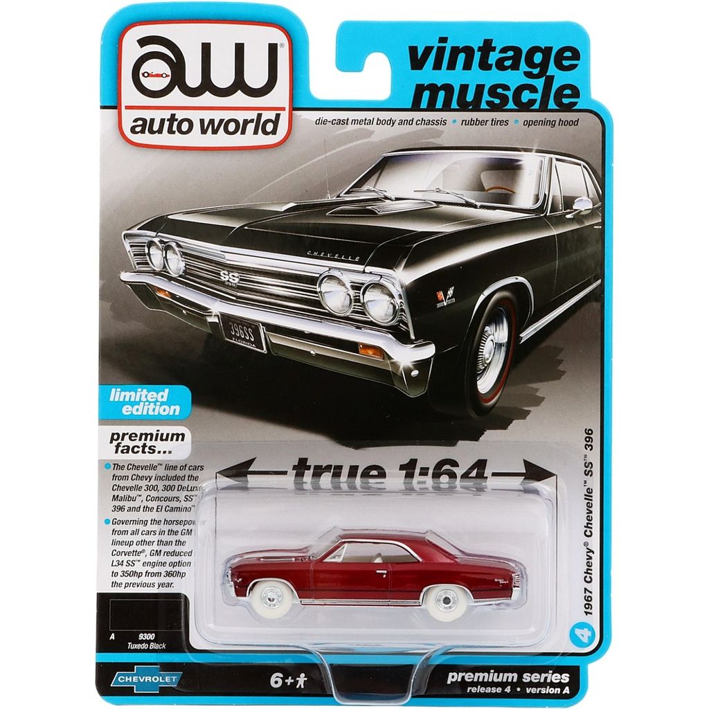 Chevy Chevelle SS 396 årsmodel 1967 fra Auto World i skala 1:64 (7,6 cm). Farven er rød, og på kortet står der Tuxedo Black (men det er ikke korrekt, for dette er en rød Chase Car). Normalt er denne Chevelle sort.