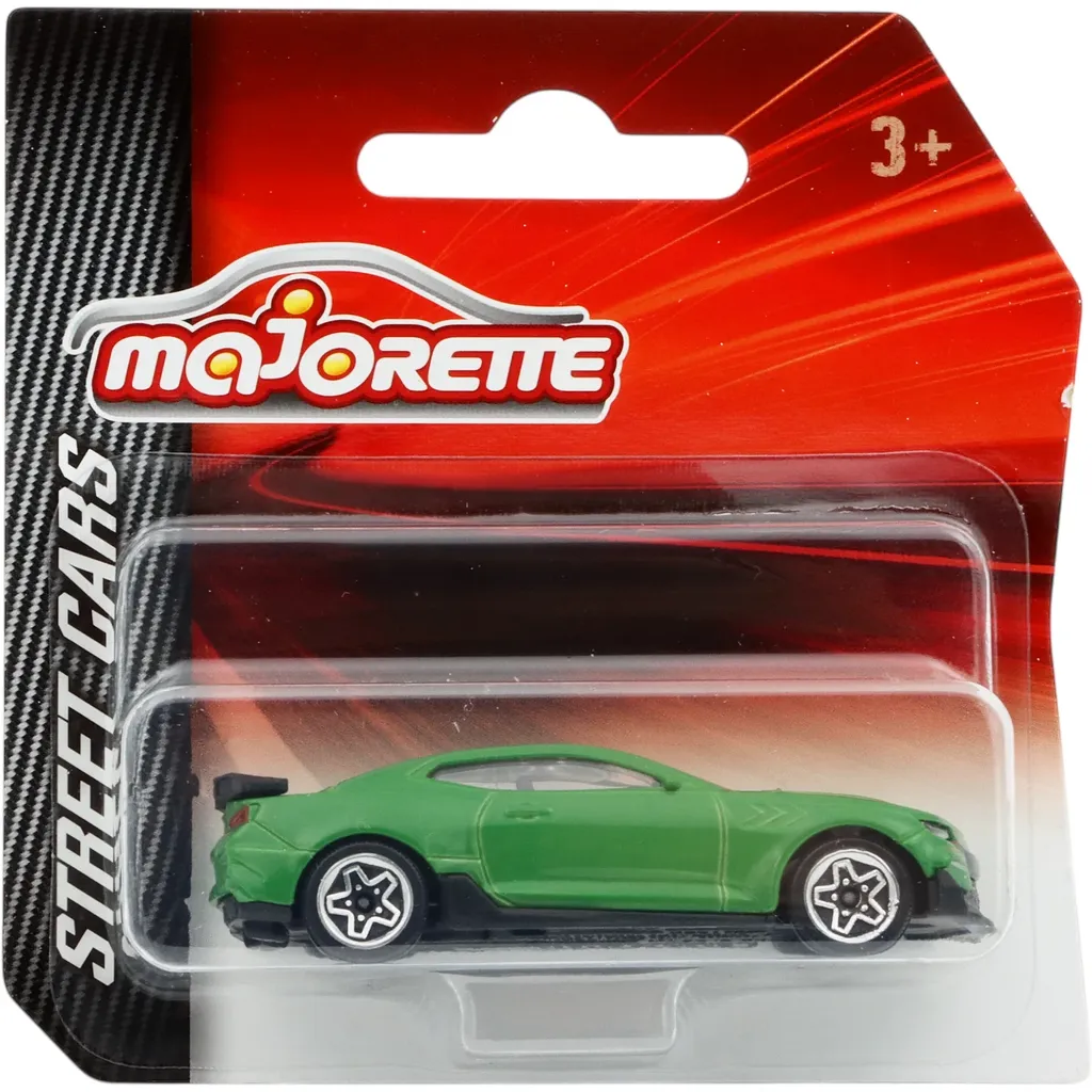 Chevrolet Camaro med grøn lak fra Majorette og Street Cars-serien. Bilen er lavet af metal med plastdetaljer og anbefales fra 3 år.