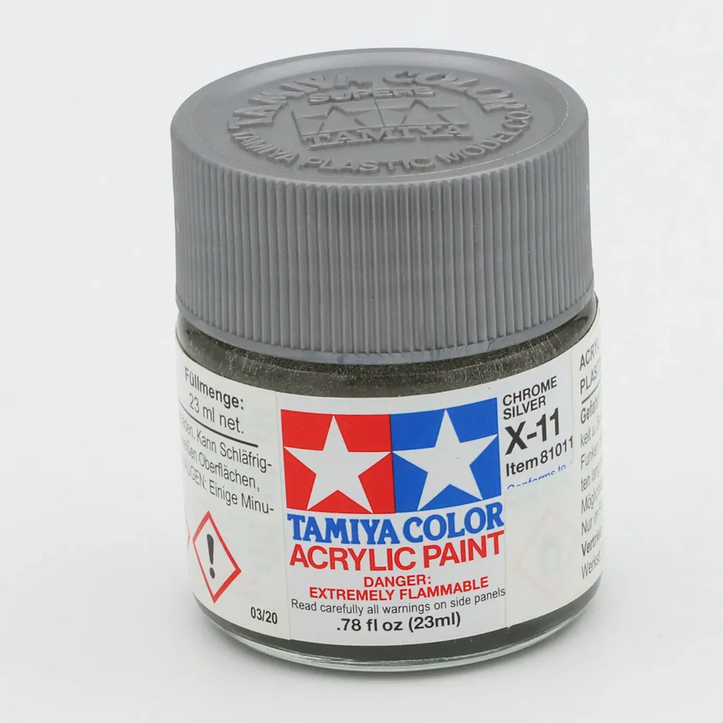 Chrome Silver (X-11) akrylmaling fra Tamiya. Dåsen indeholder 23 ml maling.
