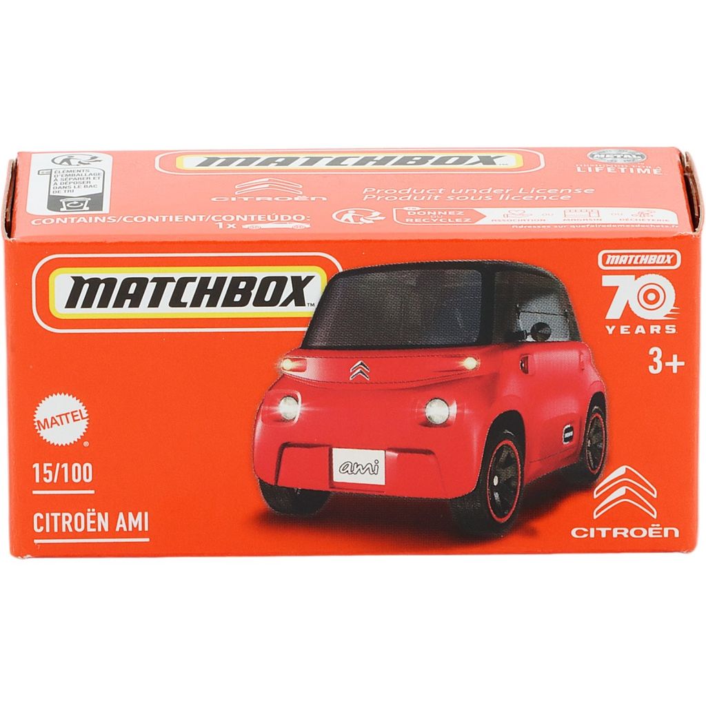 Rød Citroën AMI fra Matchbox og Power Grab-serien, hvor denne legetøjsbil er bil nummer 15/100.