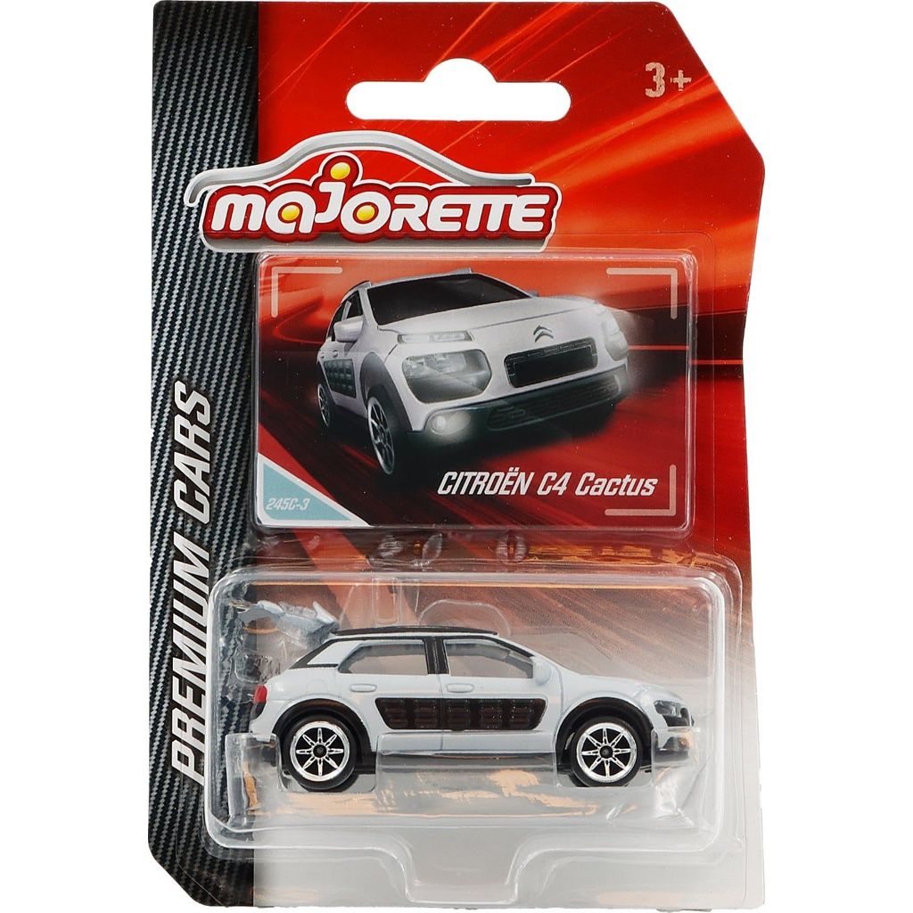 Grå (eller mørk hvid) og sort Citroën C4 Cactus fra Majorette og Premium Cars-serien. Skalaen er 1:56, hvilket giver os en C4 Cactus på ca. 7,2 cm.