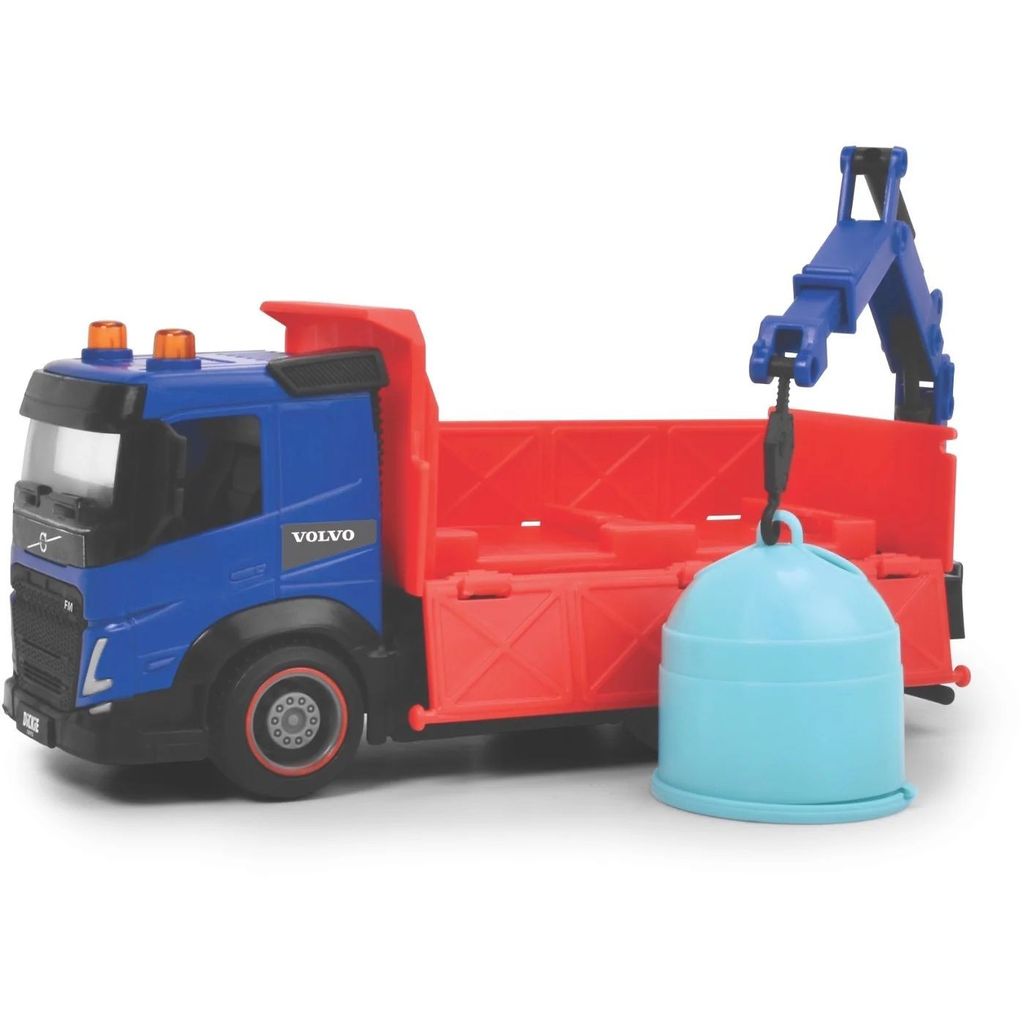 Genbrugsbil (lastbil/kranbil) fra Dickie Toys med kran og to tilhørende genbrugsbeholdere/containere. Bilen er en blå Volvo, der er 19 cm lang.