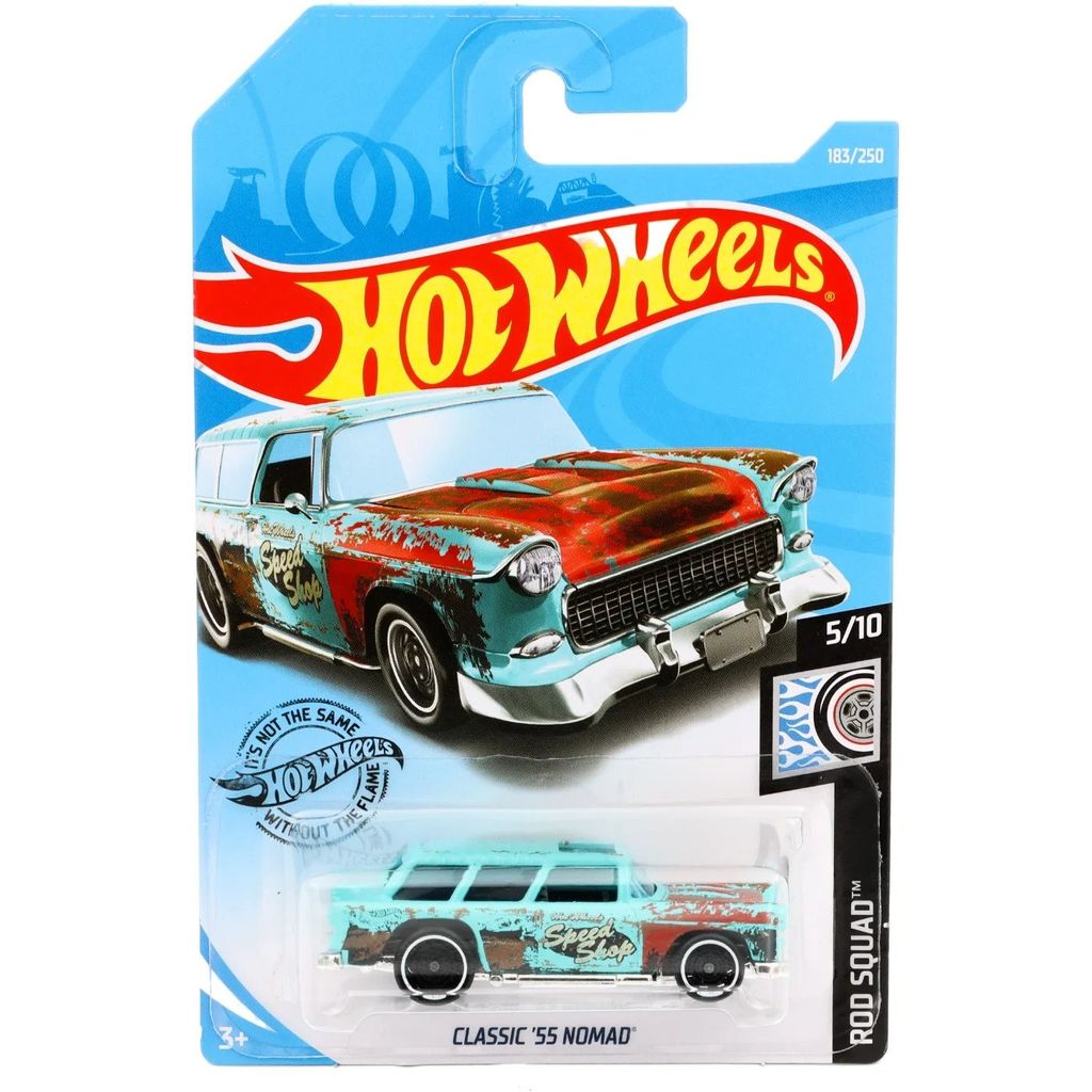 Klassisk ?55 Nomad fra Hot Wheels og Rod Squad-serien, hvor denne legetøjsbil er bil nummer 5/10. Bilen er inkluderet i L-kassen "internationale lange kort" (C4982) 2019.