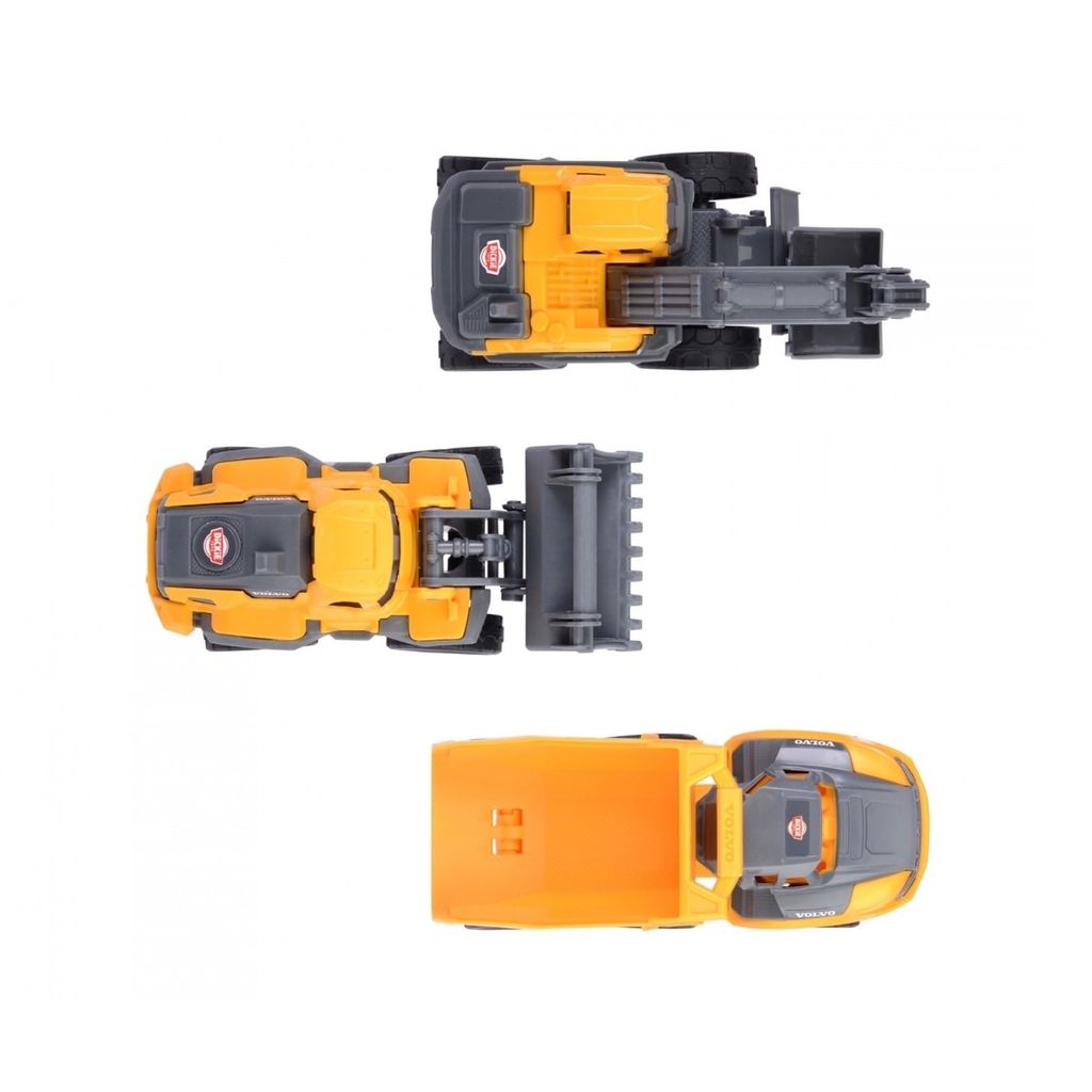 Volvo dumper, læssemaskine og gravemaskine fra Dickie Toys tilpasset udendørs leg, men fungerer også godt indendørs.